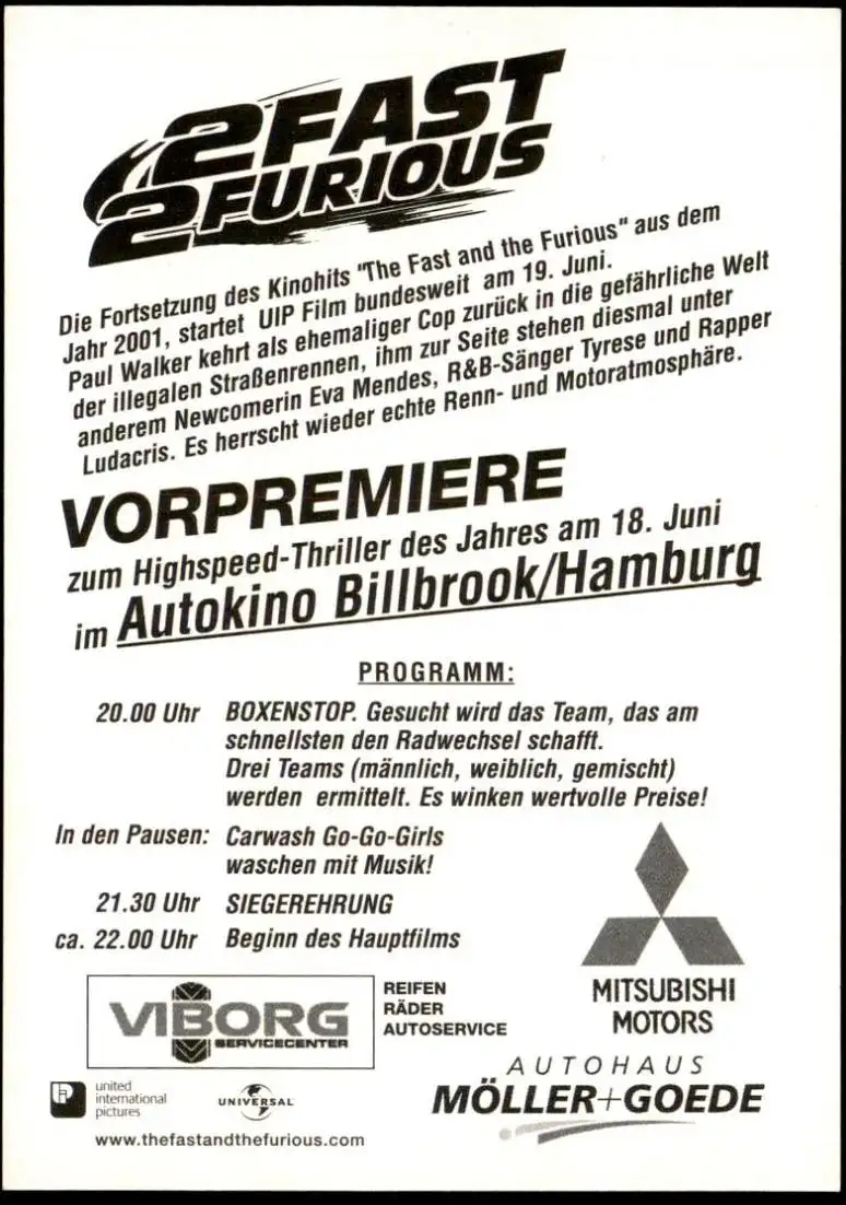 ÄLTERE KARTE 2FAST 2FURIOUS FILM KINO HONDA S2000 SEMI NUDE WOMAN VORPREMIERE AUTOKINO HAMBURGVerlag: unbekannt