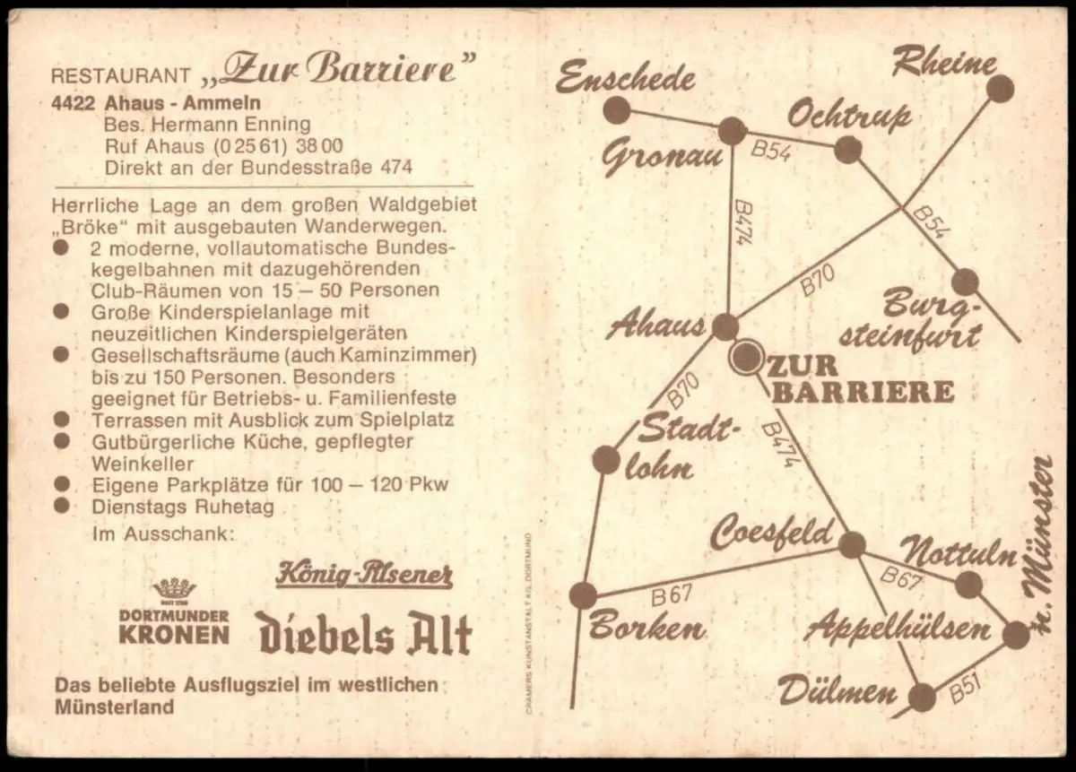 ÄLTERE KARTE AHAUS AMMELN RESTAURANT ZUR BARRIERE BESITZER HERMANN ENNING AN DER B474 DIEBELS KRONEN BIER KARTE ENSCHEDE GRONAU OCHTRUP RHEINE BURGSTEINFURT NOTTULN APPELHÜLSEN DÜLMEN BORKEN COESFELD STADTLOHN NACH MÜNSTERVerlag: unbekannt
