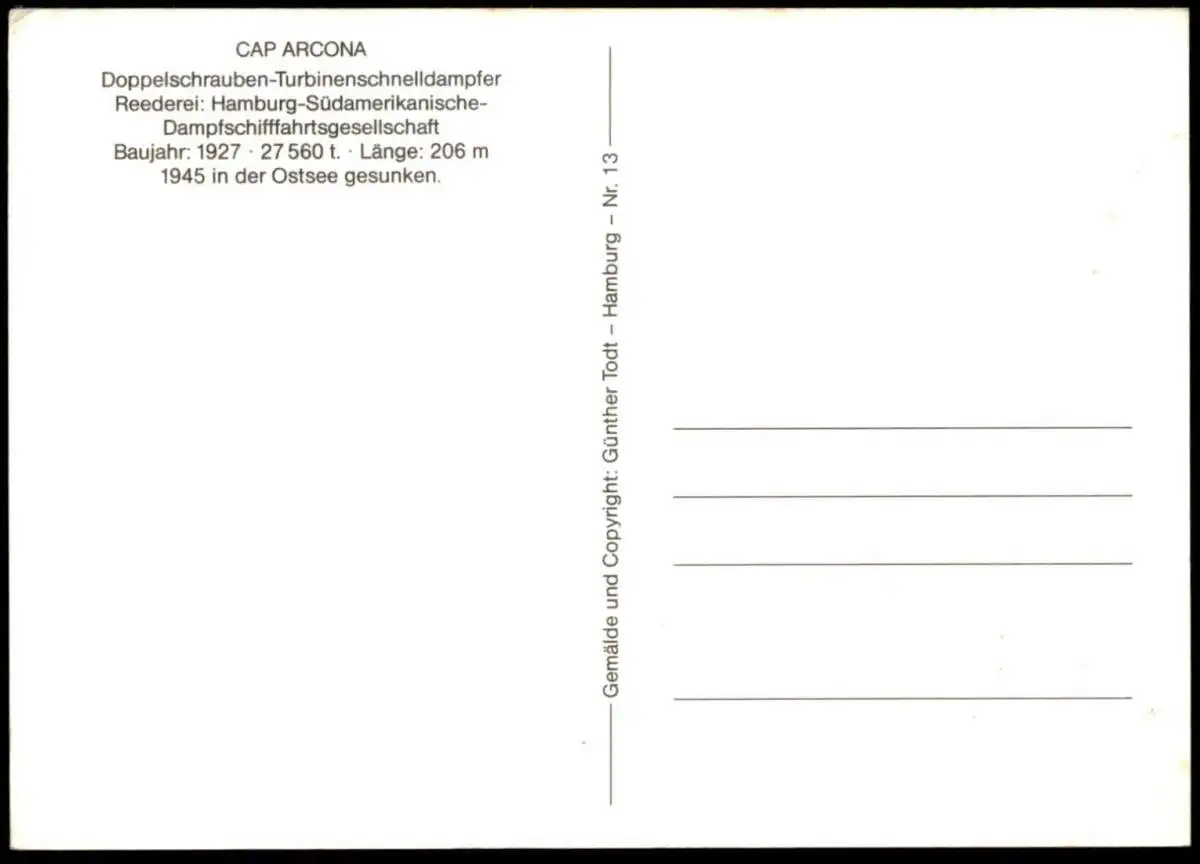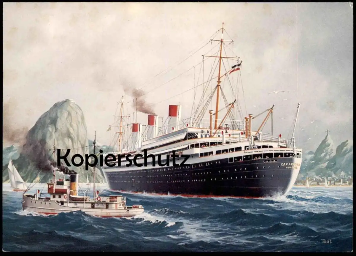ÄLTERE KÜNSTLER POSTKARTE CAP ARCONA BAUJAHR 1927 HAMBURG-SÜDAMERIKANISCHE-DAMPFSCHIFFFAHRTSGESELLSCHAFT 1945 IN DER OSTSEE GESUNKEN DAMPFER MALER GÜNTHER TODTVerlag: Günther Todt, Hamburg