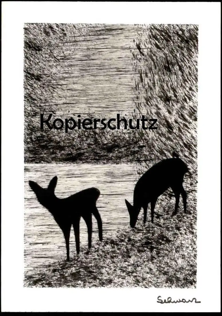 ÄLTERE KÜNSTLER POSTKARTE LINOLSCHNITT REH HIRSCH Rehe Roe fallow deer daim chevreuil cerf Schwarz Linol Ansichtskarte