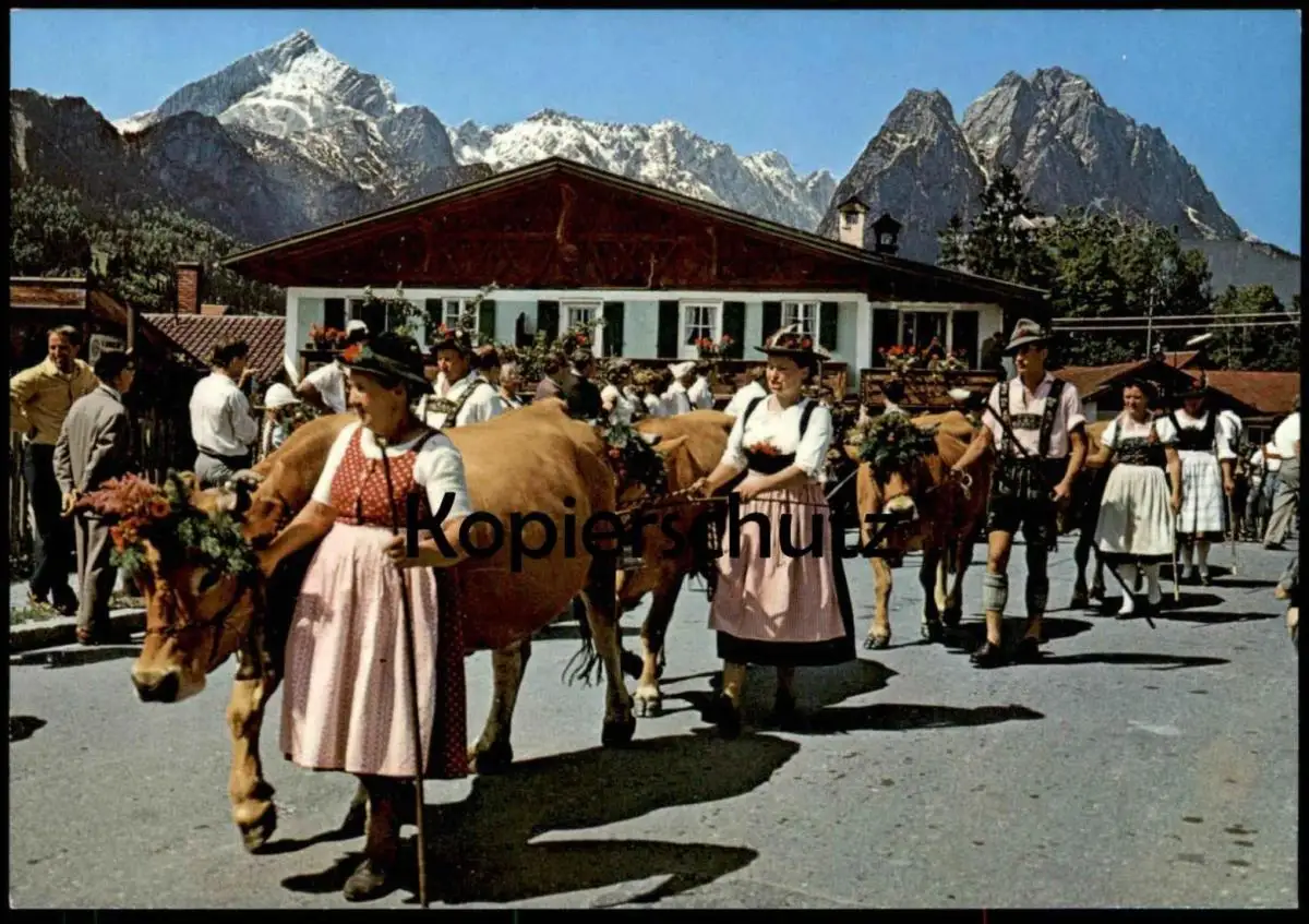 ÄLTERE POSTKARTE ALMABTRIEB FESTSCHMUCK ZUGSPITZGRUPPE ZUGSPITZE BAYERN Kuh Kühe vache cow cows postcard Ansichtskarte