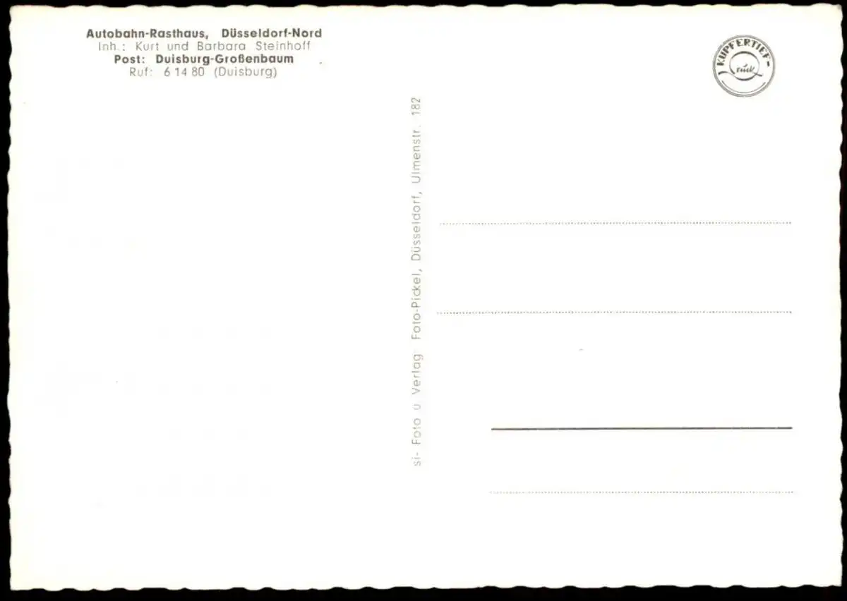 ÄLTERE POSTKARTE AUTOBAHN-RASTHAUS DÜSSELDORF-NORD INHABER KURT & BARBARA STEINHOFF POST DUISBURG-GROSSENBAUMVerlag: Foto Pickel, DüsseldorfGelaufen: neinErhaltung (s. Scan): sehr gut / 918726