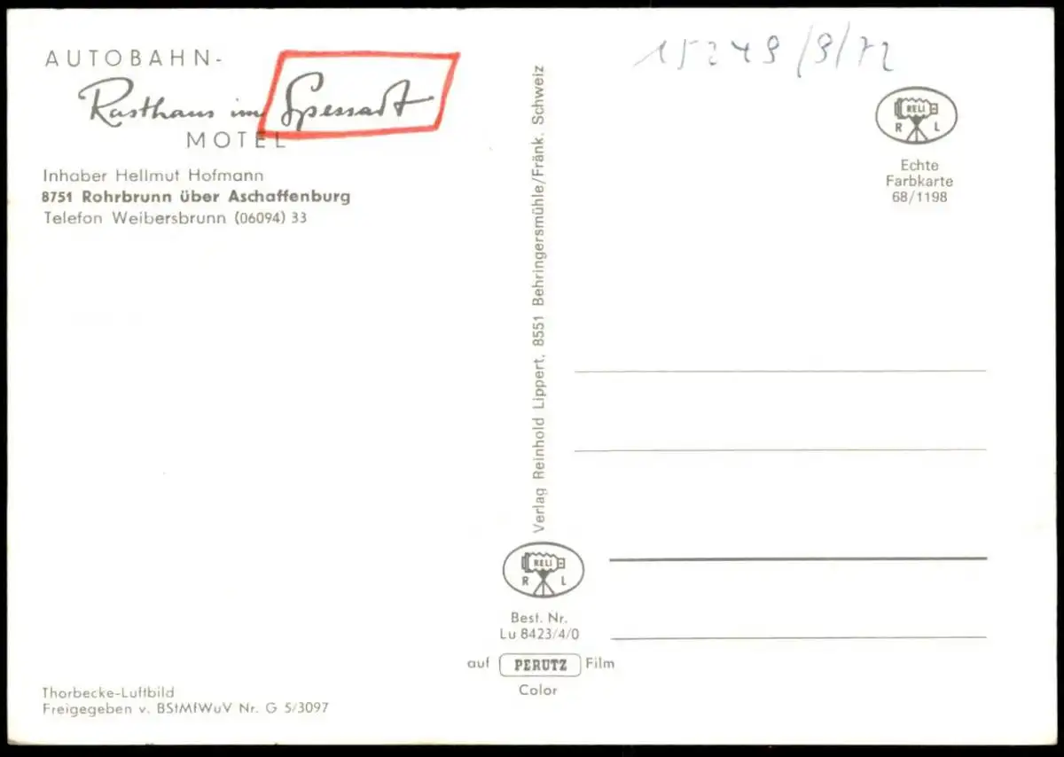 ÄLTERE POSTKARTE AUTOBAHN-RASTHAUS IM SPESSART MOTEL ROHRBRUNN ÜBER ASCHAFFENBURG INHABER HELMUT HOFMANN RASTSTÄTTEVerlag: Reinhold Lippert, Behringersmühle Fränkische Schweiz; Thorbecke Luftbild