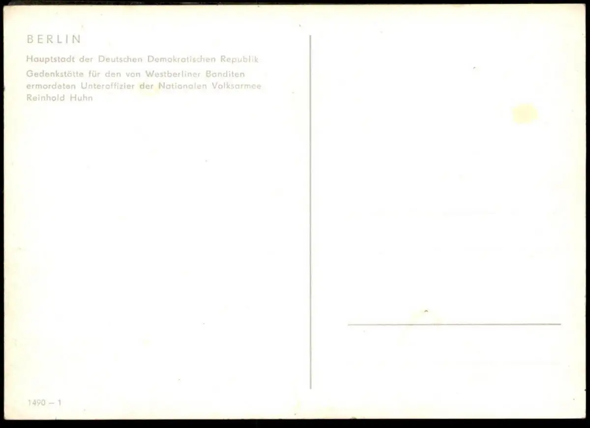ÄLTERE POSTKARTE BERLIN HAUPTSTADT DER DDR GEDENKSTÄTTE FÜR DEN VON WESTBERLINER BANDITEN ERMORDETEN UNTEROFFIZIER DER NATIONALEN VOLKSARMEE NVA REINHOLD HUHN SEIN TOD IST UNS VERPFLICHTUNGVerlag: unbekannt
