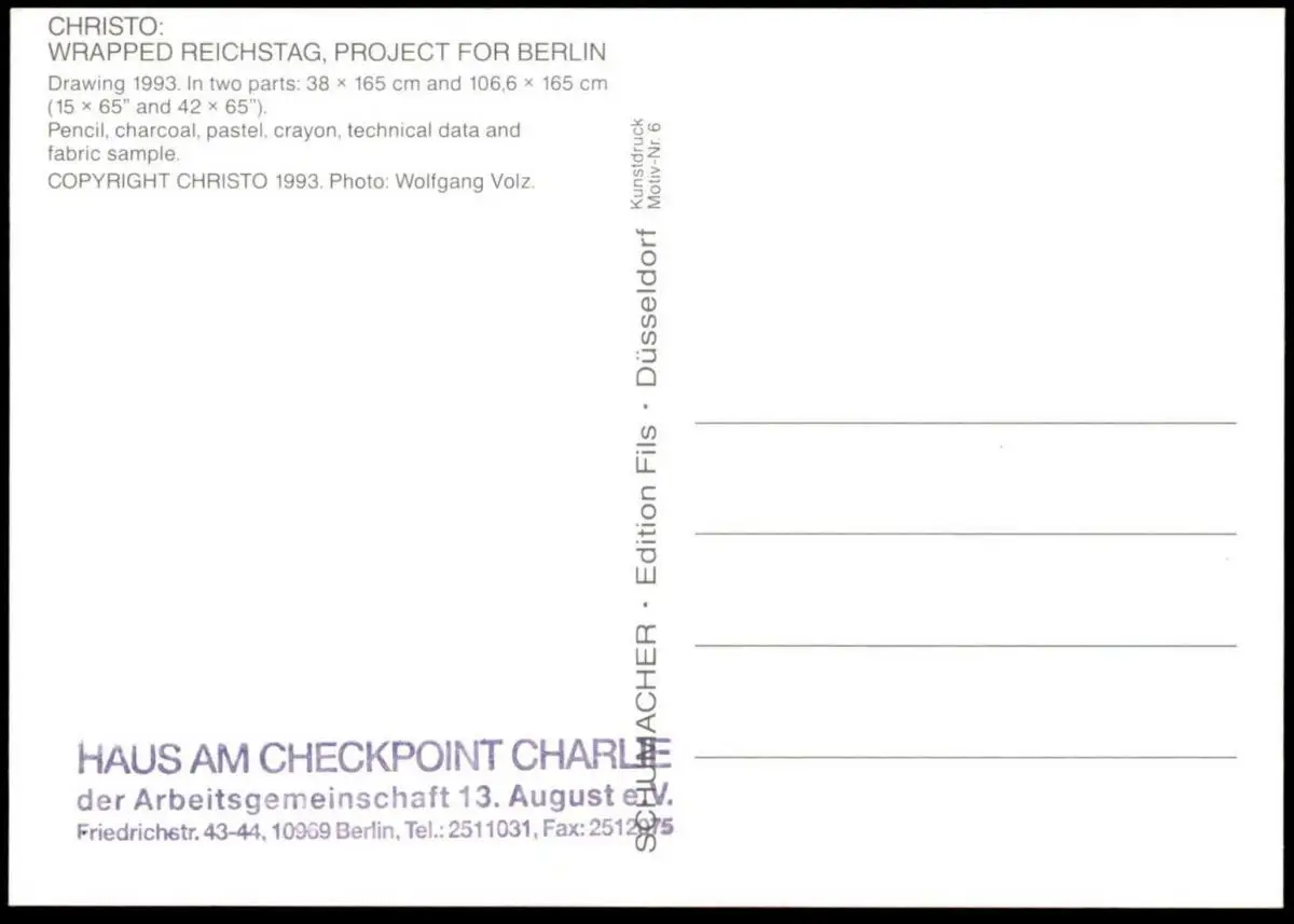 ÄLTERE POSTKARTE BERLIN VERHÜLLTER REICHSTAG DURCH CHRISTO DRAWING 1993 IN TWO PARTS STEMPEL HAUS AM CHECKPOINT CHARLIE Verlag: Schumacher, Edition Fils, Düsseldorf; Photo: Wolfgang Volz
