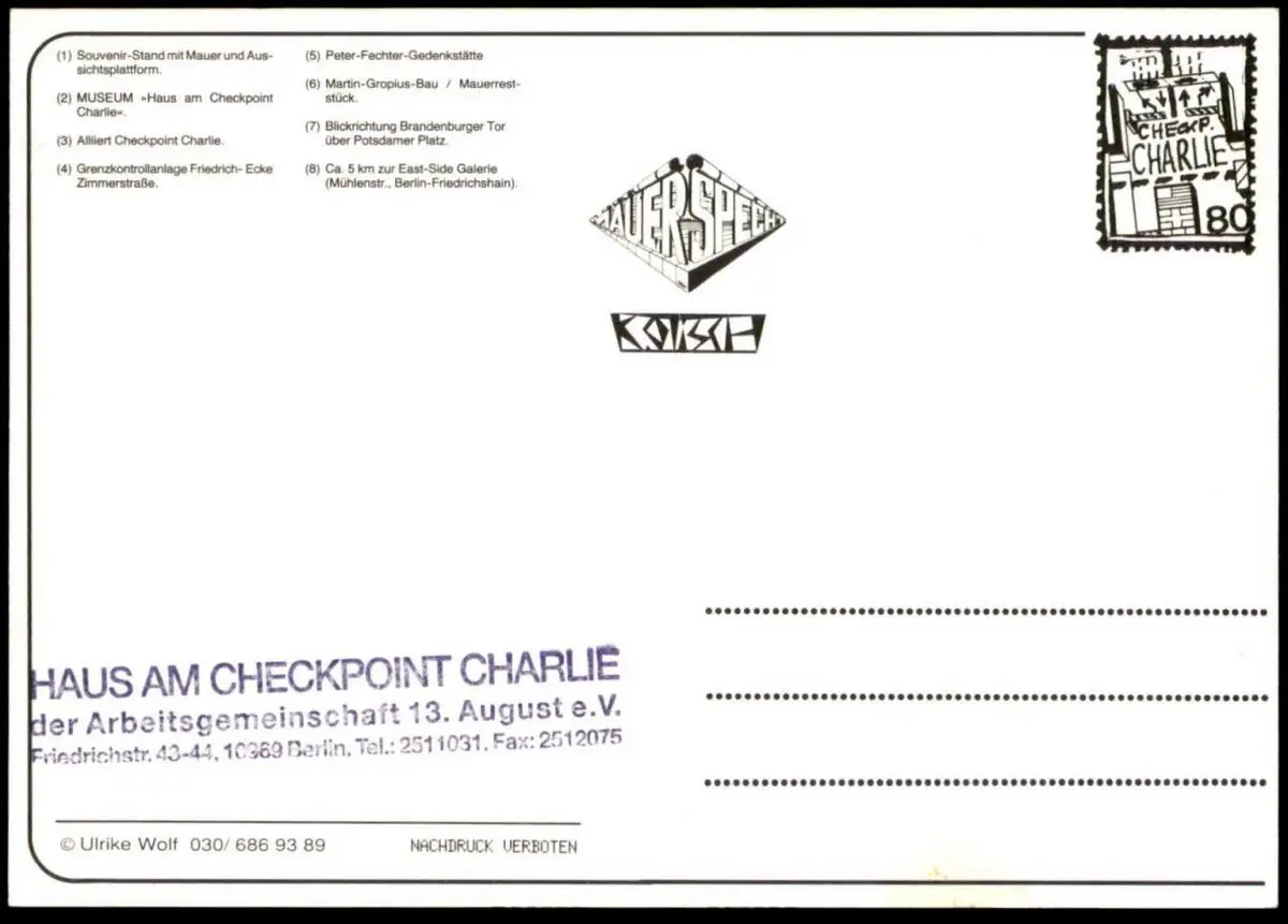 ÄLTERE POSTKARTE BERLIN ZIMMERSTRASSE FRIEDRICHSTRASSE SOUVENIR-STAND MIT MAUER UND AUSSICHTSPLATTFORM MUSEUM HAUS AM CHECKPOINT CHARLIE ALLIED CHECKPOINT GRENZKONTROLLANLAGE FRIEDRICH-ECKE ZIMMERSTRASSE PETER-FECHTER-GEDENKSTÄTTE MARTIN-GROPIUS-BAU MAUERRESTSTÜCK BLICKRICHTUNG BRANDENBURGER TOR ÜBER POTSDAMER PLATZ CA. 5 KM ZUR EAST SIDE GALERIE MÜHLENSTRASSE BERLIN FRIEDRICHSHAIN STEMPEL HAUS AM CHECKPOINT CHARLIEVerlag: Ulrike Wolf, Berlin
