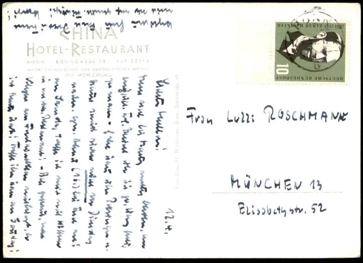 Gelaufen: 12.04.1957 mit Stempel Bonn nach MünchenErhaltung (s. Scan): gut - mittel, Ecken leicht bestoßen, vorderseitig handschriftlich Bonn am Rhein / 915407