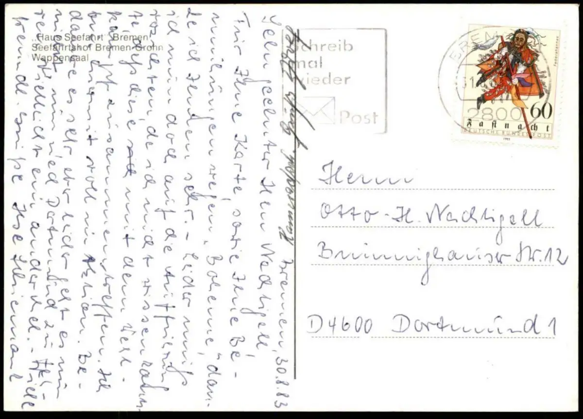 Gelaufen: 30.08.1983 mit Stempel Bremen nach Dortmund