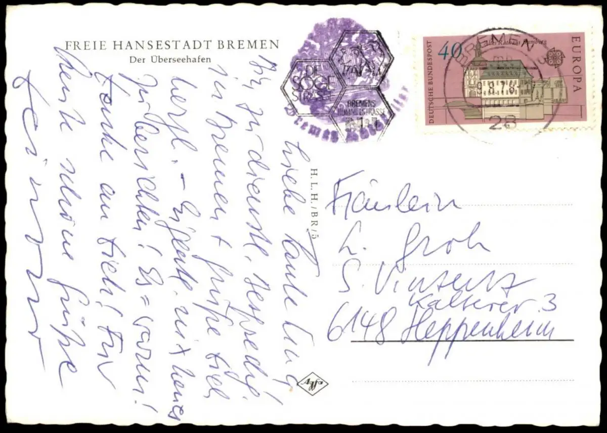 Gelaufen: 09.08.1978 mit Stempel Bremen nach Heppenheim