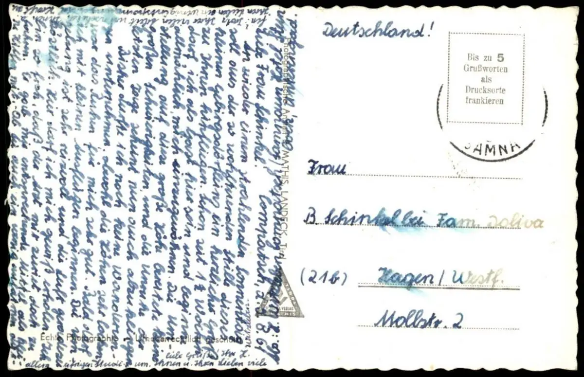 Gelaufen: 05.08.1961 nach Hagen, Briefmarke (sauber) entfernt