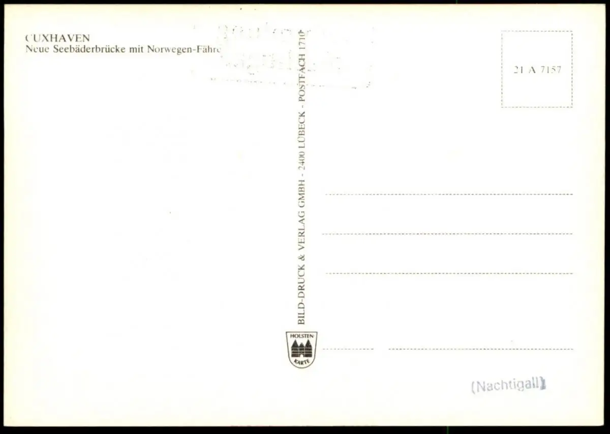 ÄLTERE POSTKARTE CUXHAVEN NEUE SEEBÄDERBRÜCKE MIT NORWEGEN-FÄHREVerlag: Bild Druck & Verlag GmbH, LübeckGelaufen: neinErhaltung (s. Scan): gut / 918288