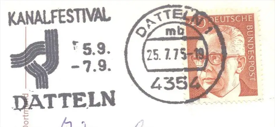 Gelaufen: 25.07.1975 mit Stempel Datteln sowie Maschinenwerbestempel „Kanalfestival Datteln 05.09. - 07.09.“ nach Pinneberg