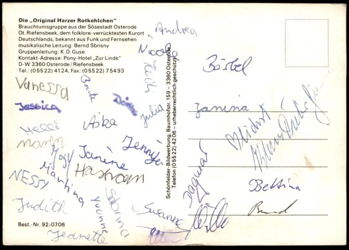 ÄLTERE POSTKARTE DIE ORIGINAL HARZER ROTKEHLCHEN RIEFENSBEEK OSTERODE HARZ BERND SBRISNY KLAUS DIETER GUSE CHOR MUSIK HARZ ORIGINAL UNTERSCHRIFTEN AUTOGRAMM
