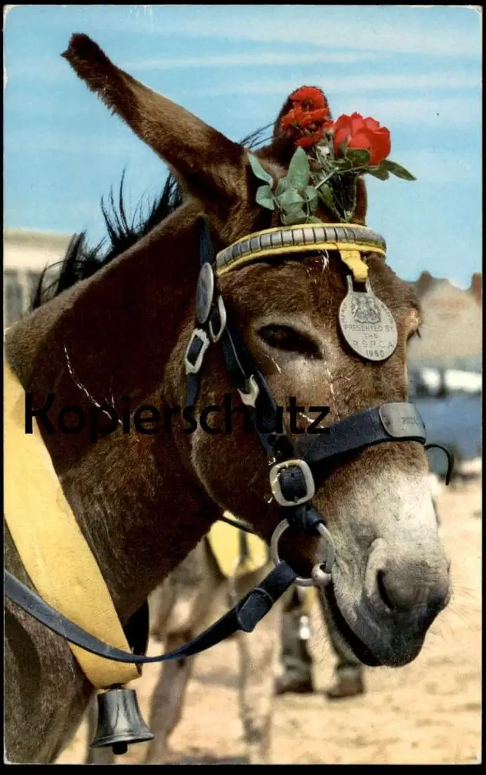 ÄLTERE POSTKARTE DONKEY PRESENTED BY RSPCA MERIT AWARD 1950 BADGE Esel ane published John Hinde Studios London postcard