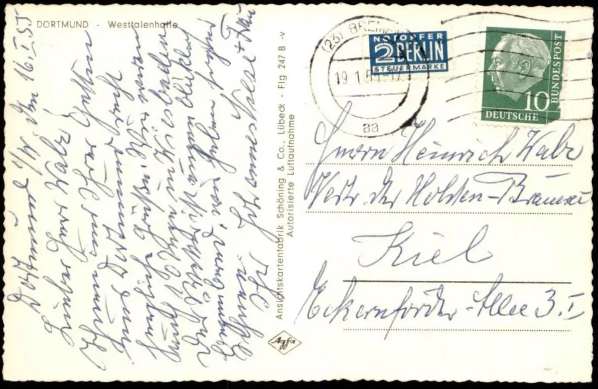 Gelaufen: 19.01.1955 mit Stempel Bremen nach Kiel