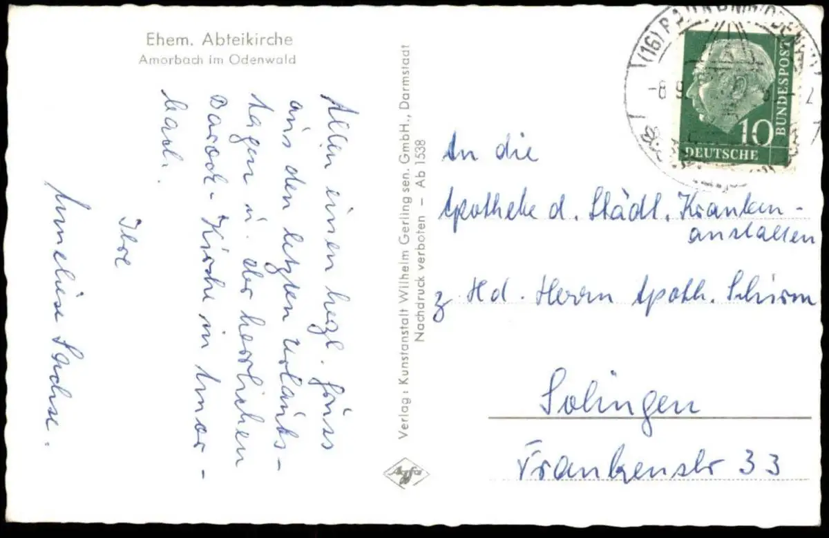 ÄLTERE POSTKARTE EHEMALIGE ABTEIKIRCHE AMORBACH IM ODENWALDVerlag: Wilhelm Gerling, Darmstadt