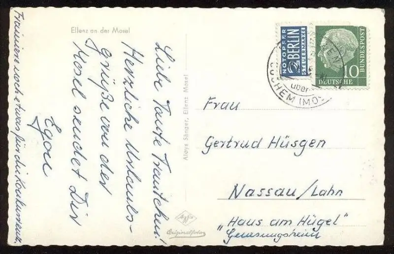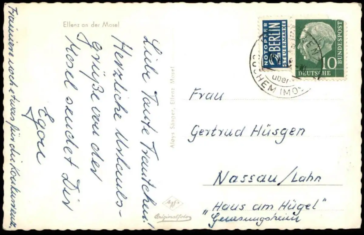 Gelaufen: xx.xx.196x mit Stempel Ellenz über Cochem nach Nassau Lahn