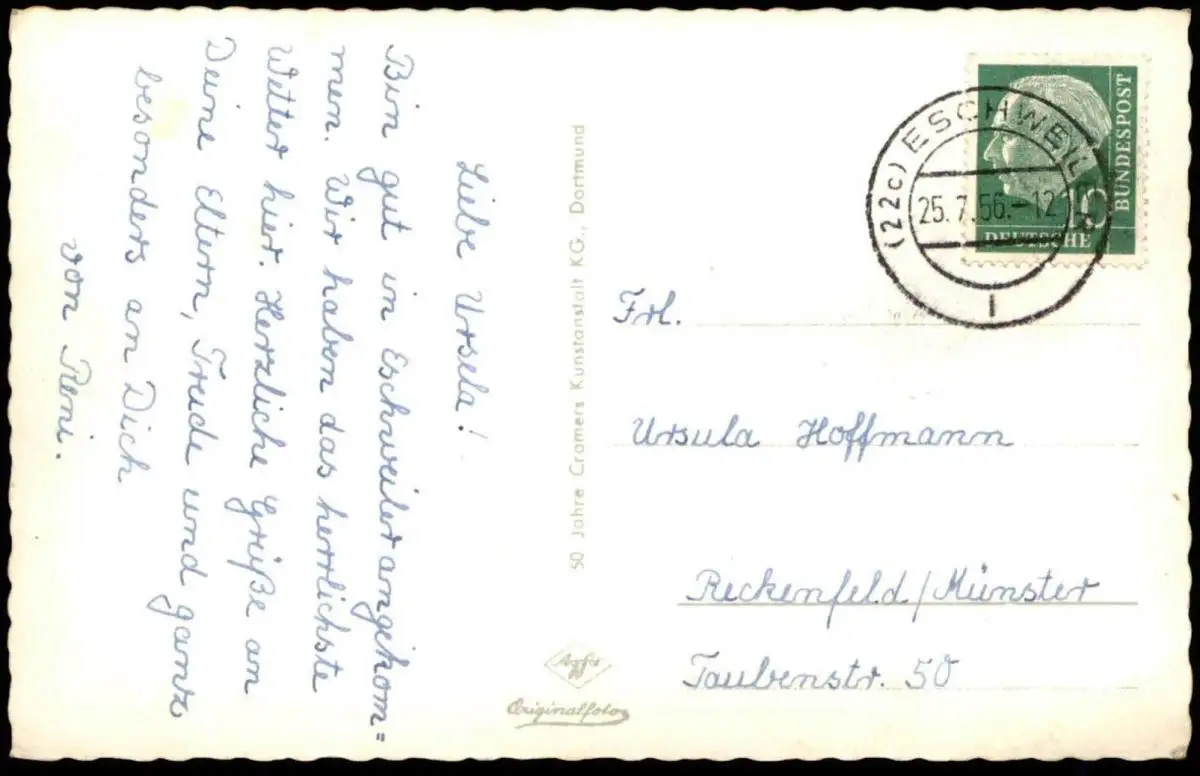 Verlag: Cramers, DortmundGelaufen: 25.07.1956 mit Stempel Eschweiler nach ReckenfeldErhaltung (s. Scan): gut / 915421