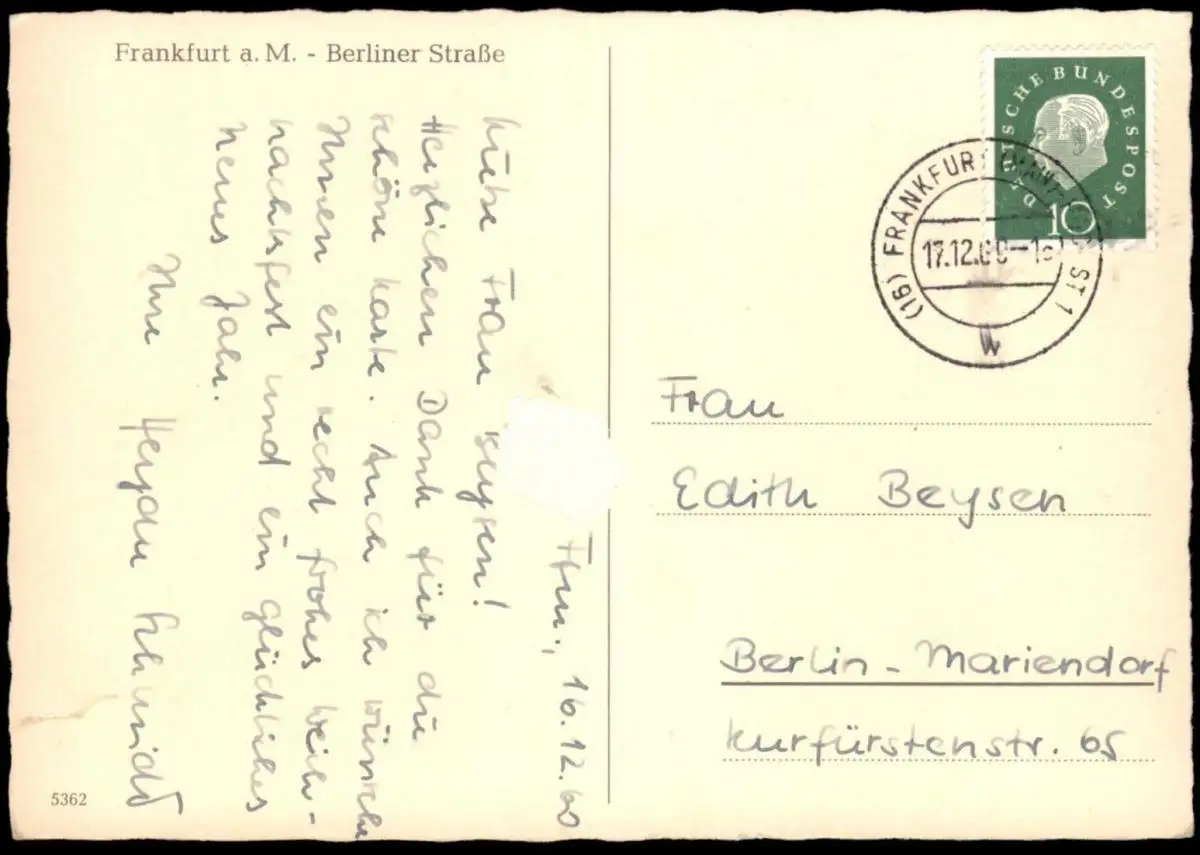 Gelaufen: 17.12.1960 mit Stempel Frankfurt nach Berlin - Mariendorf