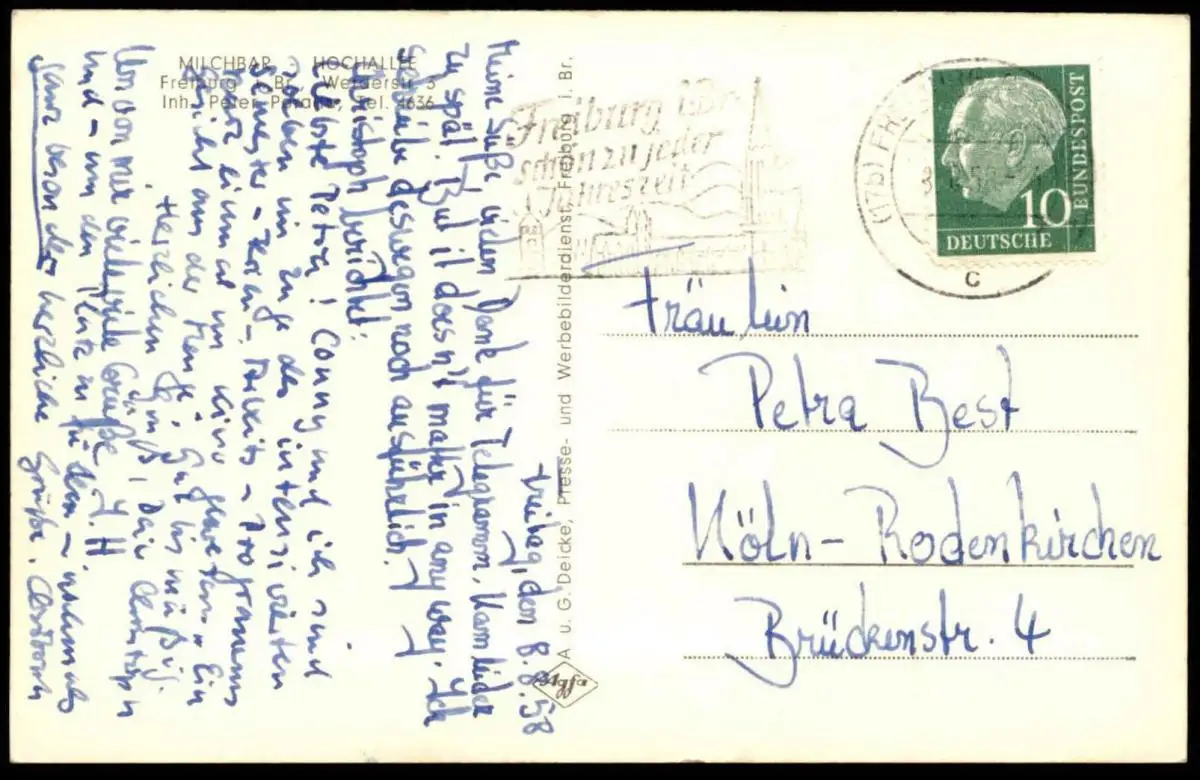 Gelaufen: 08.08.1958 mit Stempel Freiburg nach Köln-Rodenkirchen