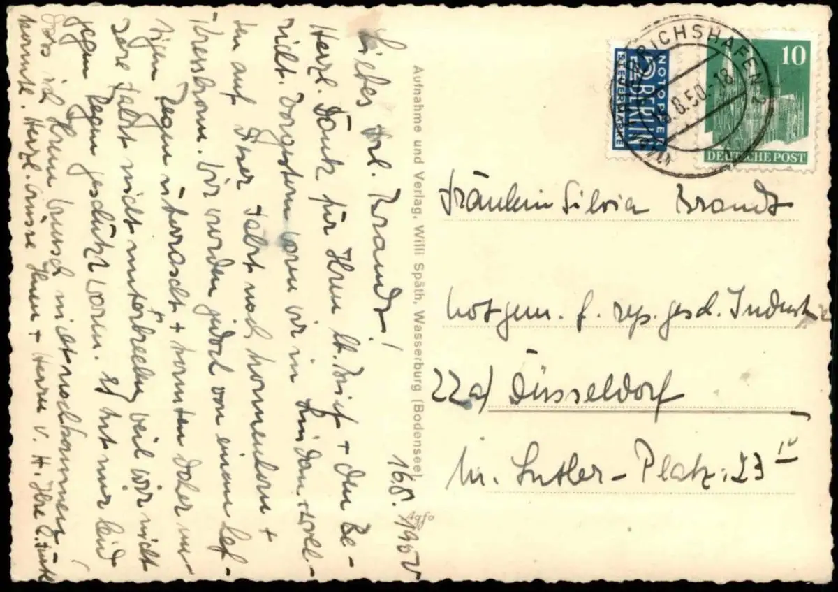 Gelaufen: 15.08.1950 mit Stempel Friedrichshafen nach DüsseldorfErhaltung (s. Scan): gut / 915640