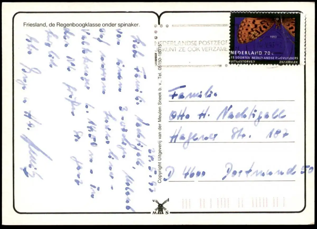 Gelaufen: 24.05.1993 mit Briefmarke Niederlande Schmetterling nach Dortmund