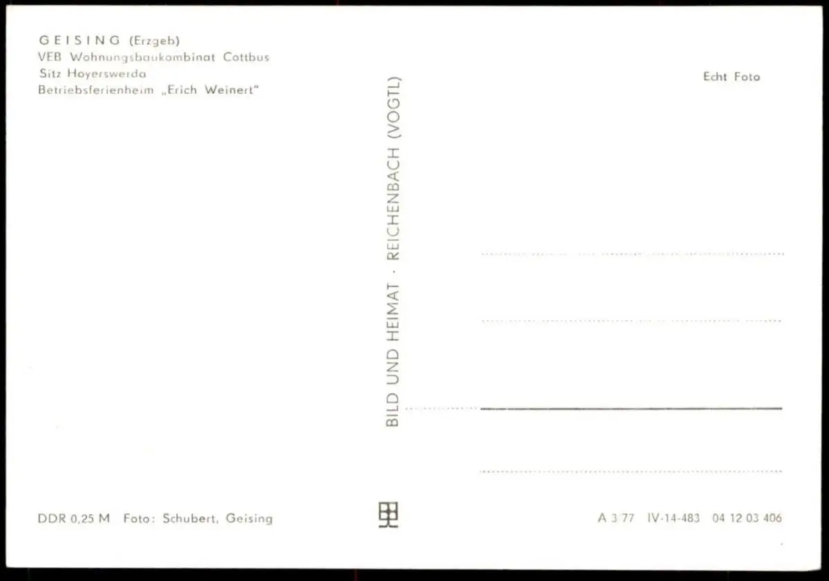 ÄLTERE POSTKARTE GEISING VEB WOHNUNGSBAUKOMBINAT COTTBUS BETRIEBSFERIENHEIM ERICH WEINERT ERZGEBIRGE SACHSEN ALTENBERG