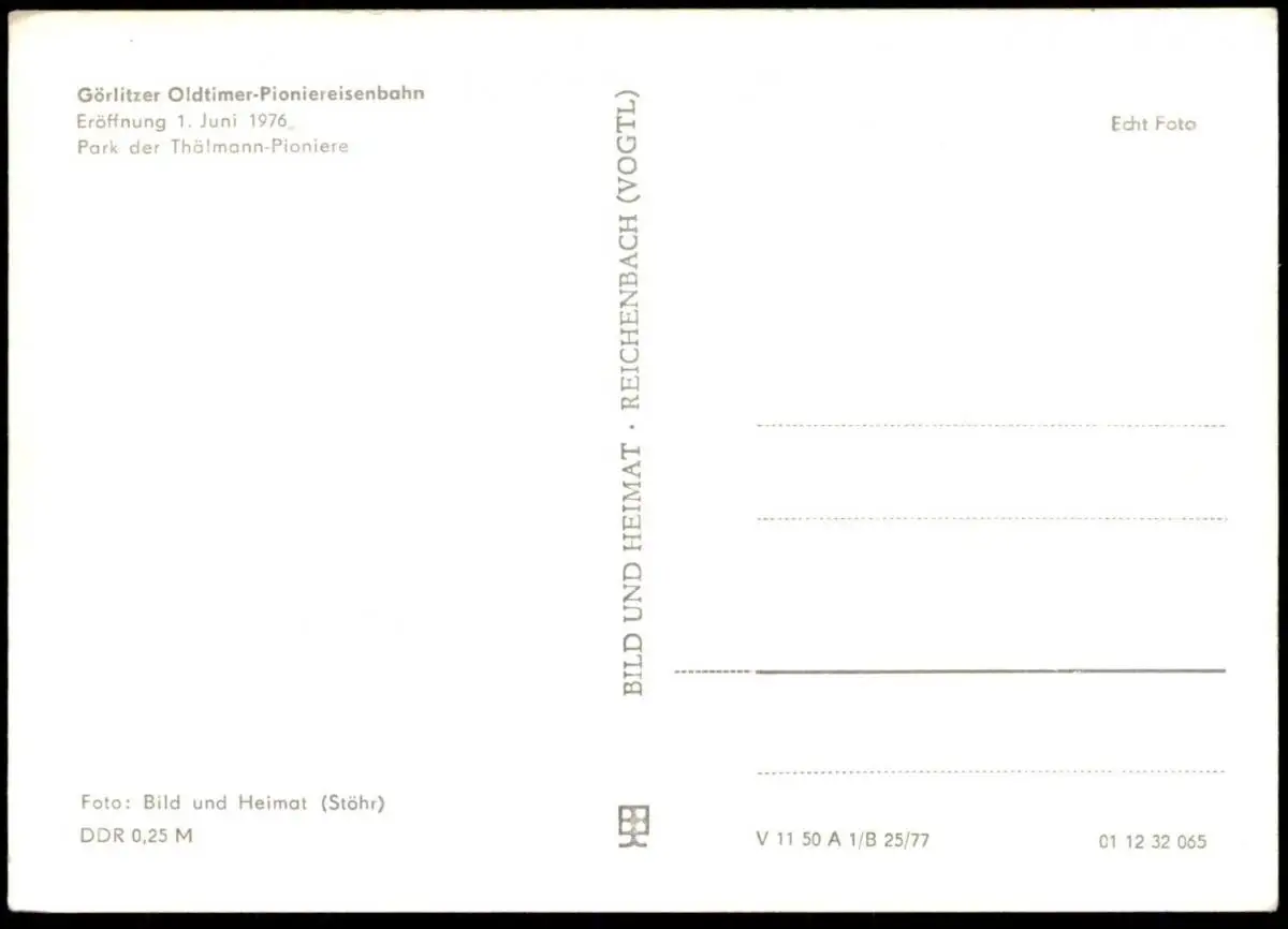ÄLTERE POSTKARTE GÖRLITZ OLDTIMER-PIONIEREISENBAHN,ERÖFFNUNG 01. JUNI 1976 PARK DER THÄLMANN-PIONIEREVerlag: Bild und Heimat, Reichenbach