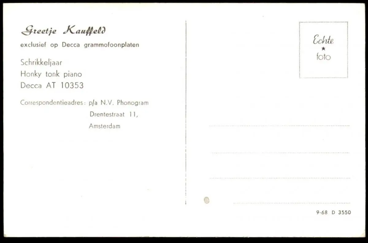 ÄLTERE POSTKARTE GREETJE KAUFFELD ORIGINAL UNTERSCHRIFT SÄNGERIN MUSIKERIN EXCLUSIEF OP DECCA GRAMMOFOONPLATEN Schrikkeljaar Honky Tonk PianoVerlag: p/a N. V. Phonogram, Amsterdam