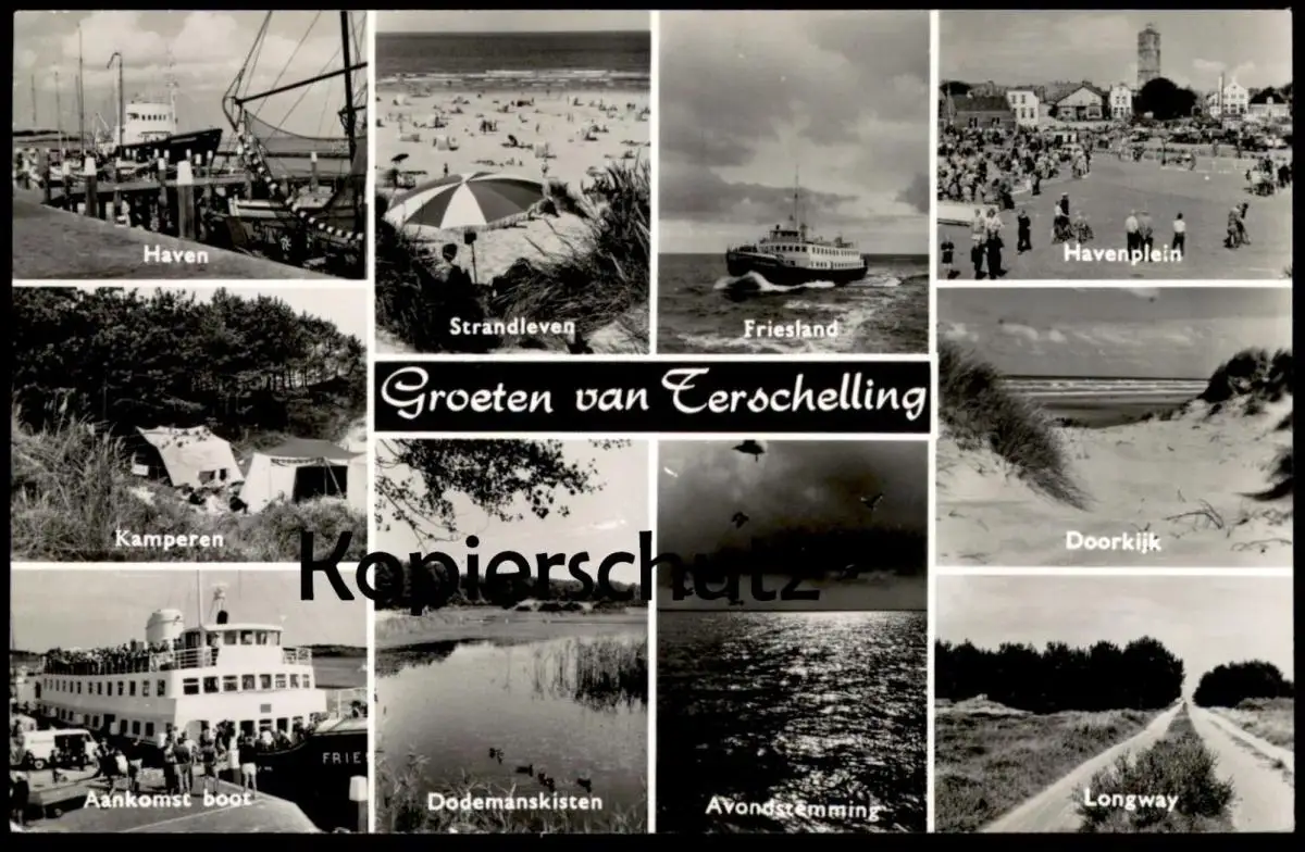 ÄLTERE POSTKARTE GROETEN VAN TERSCHELLING HAVEN STRANDLEVEN SCHIFF FRIESLAND HAVENPLEIN DOORKIJK LONGWAY AVONDSTEMMING DODEMANSKISTEN AANKOMST BOOT KAMPERENVerlag: van Leer´s Fotodruking
