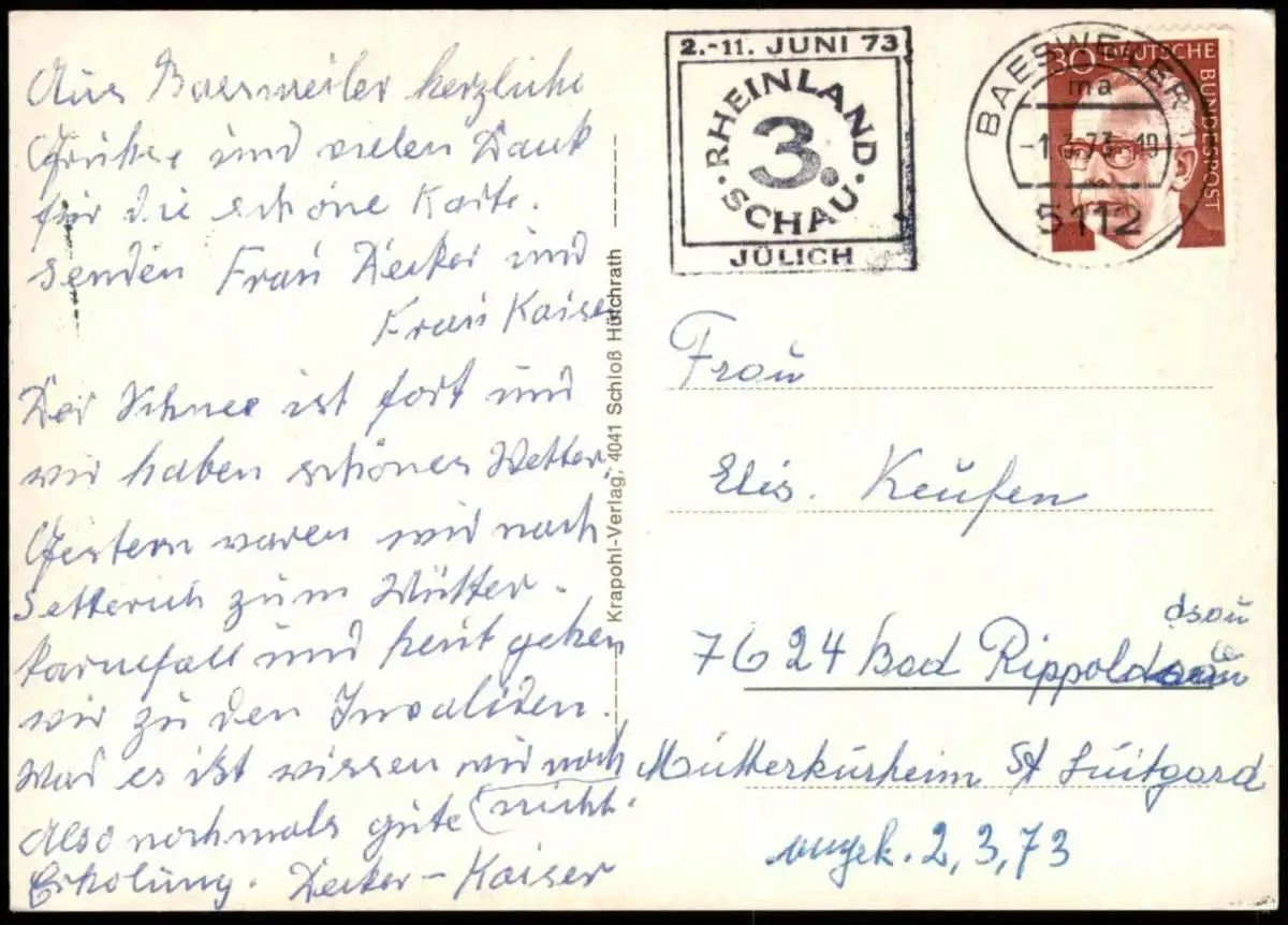 Gelaufen: 01.03.1973 mit Stempel Baesweiler “Rheinland Schau Jülich 03. - 11. Juni 1973” nach Bad RippoldsauErhaltung (s. Scan): gut / 918624