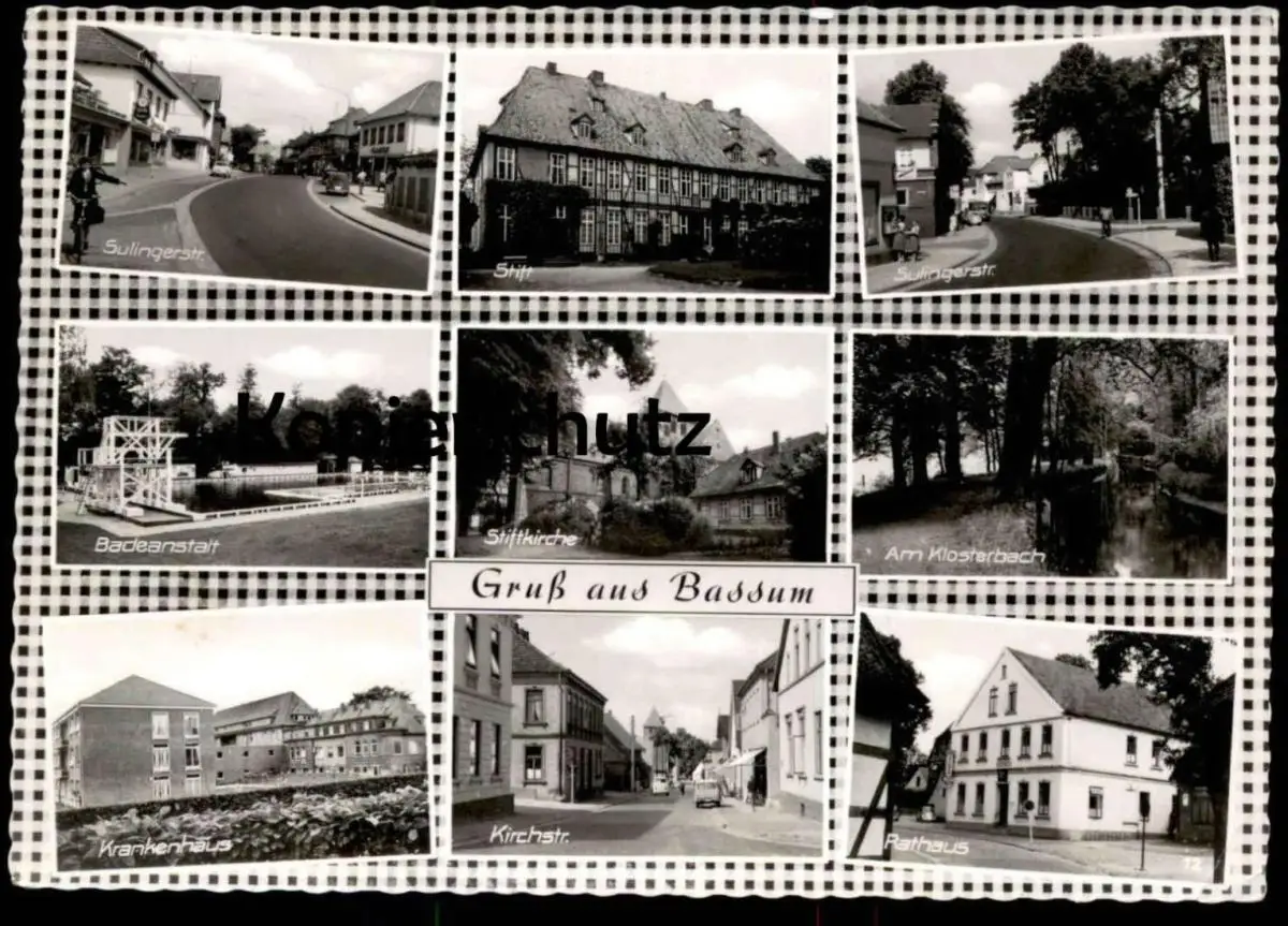 ÄLTERE POSTKARTE GRUSS AUS BASSUM SULINGER STRASSE FRANZ VICK ZENITH UHREN BADEANSTALT KIRCHSTRASSE KRANKENHAUS STIFT STIFTKIRCHE AM KLOSTERBACH RATHAUSVerlag: Ferd. Lagerbauer & Co., Hamburg