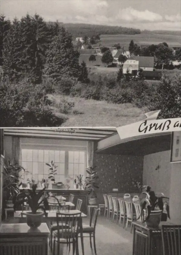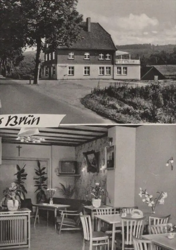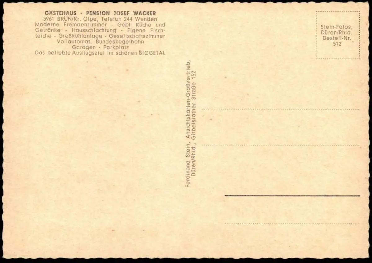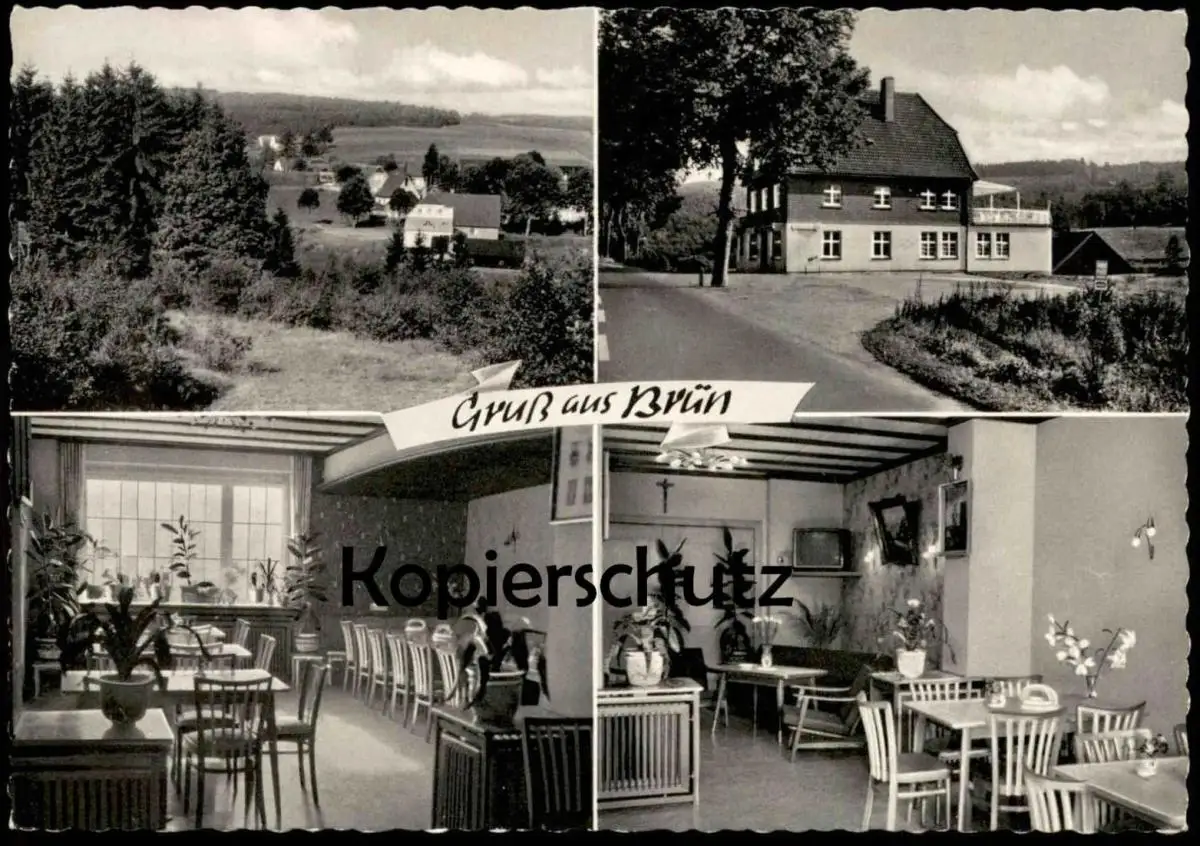 ÄLTERE POSTKARTE GRUSS AUS BRÜN KREIS OLPE GASTHAUS PENSION JOSEF WACKER HAUSSCHLACHTUNG EIGENE FISCHTEICHE GROSSKÜHLANLAGE VOLLAUTOMATISCHE BUNDESKEGELBAHN