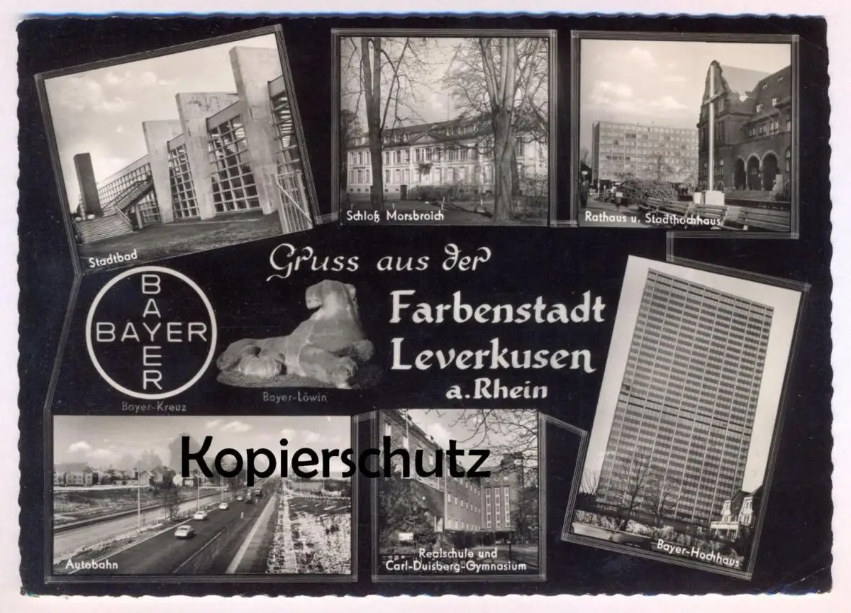 ÄLTERE POSTKARTE GRUSS AUS DER FARBENSTADT LEVERKUSEN AM RHEIN STADTBAD SCHLOSS MORSBROICH RATHAUS UND STADTHOCHHAUS BAYER LÖWIN AUTOBAHN REALSCHULE UND CARL DUISBERG GYMNASIUM BAYER-HOCHHAUS