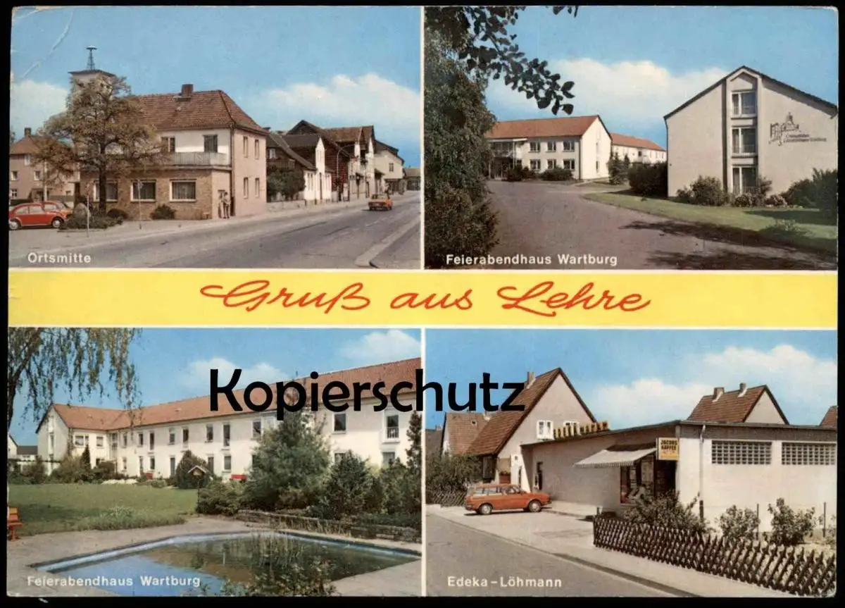 ÄLTERE POSTKARTE GRUSS AUS LEHRE NIEDERSACHSEN EDEKA LÖHMANN FEIERABENDHAUS WARTBURG ORTSMITTE Ansichtskarte postcard AK