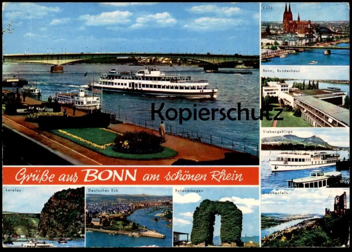 ÄLTERE POSTKARTE GRÜSSE AUS BONN AM SCHÖNEN RHEIN LORELEY KÖLN BUNDESHAUS SIEBENGEBIRGE ROLANDSBOGEN DRACHENFELS SCHIFF