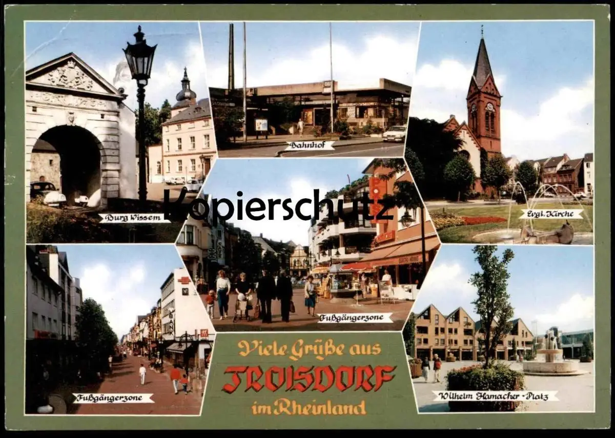 ÄLTERE POSTKARTE GRÜSSE AUS TROISDORF BURG WISSEM; FUSSGÄNGERZONE MIT ELEKTRO MENNE, DAK, PORST; BAHNHOF; WILHELM-HAMACHER-PLATZ; EVGL. KIRCHEVerlag: Krapohl, Schloss Hülchrath