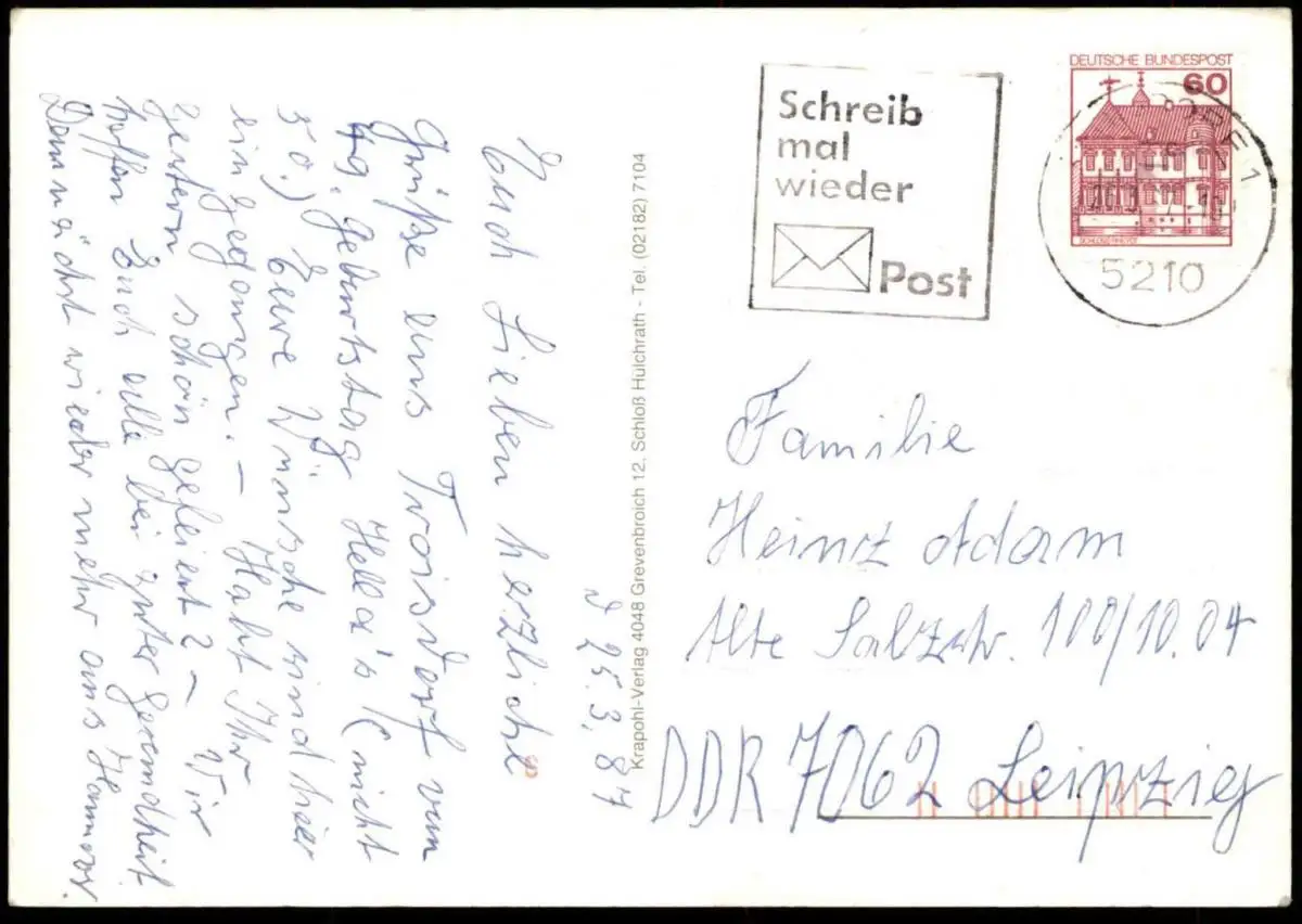 Gelaufen: 26.03.1987 mit Stempel Troisdorf 1 nach LeipzigErhaltung (s. Scan): gut, Ecken minimal bestoßen / 915338