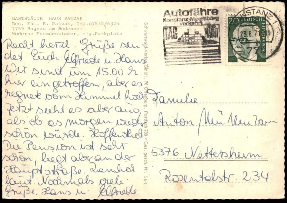 Gelaufen: 23.08.1971 mit Stempel Konstanz nach Nettersheim