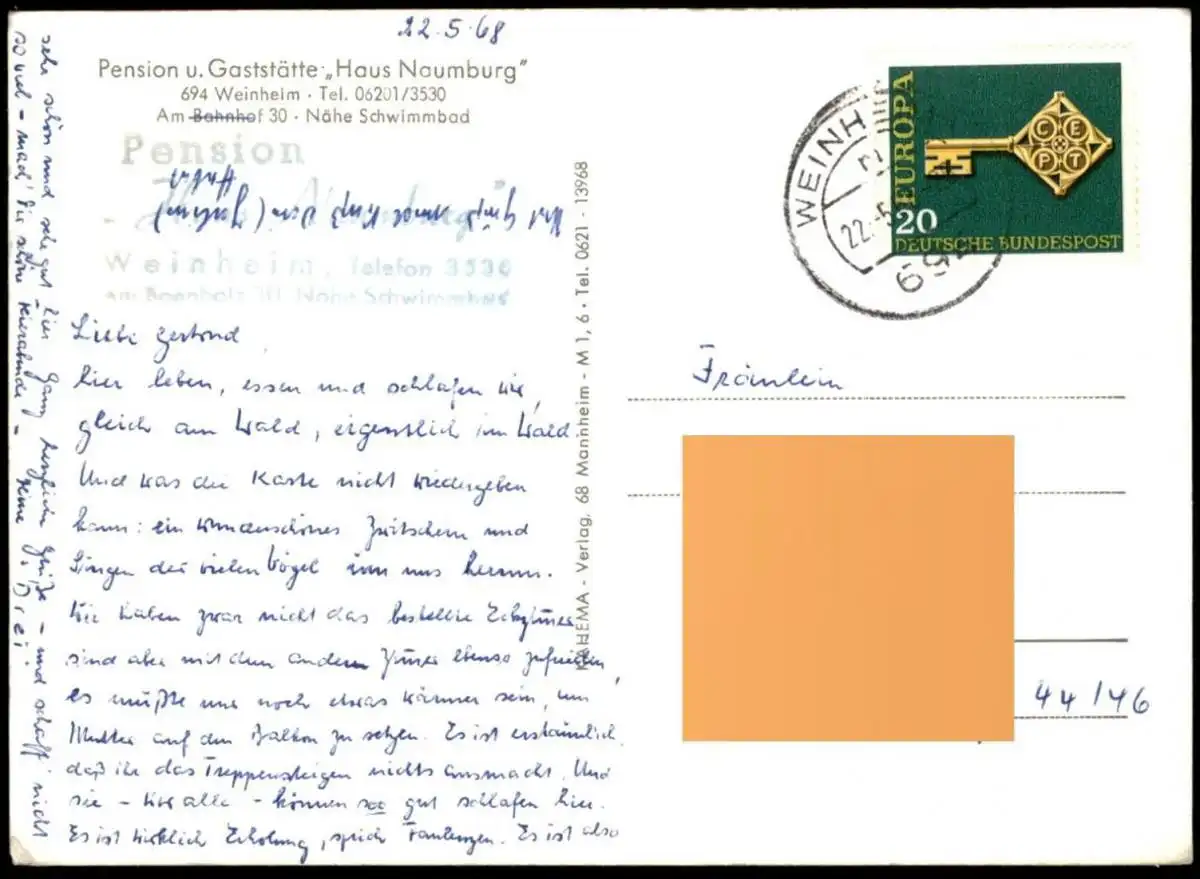 Gelaufen: 22.05.1968 mit Stempel Weinheim nach Köln