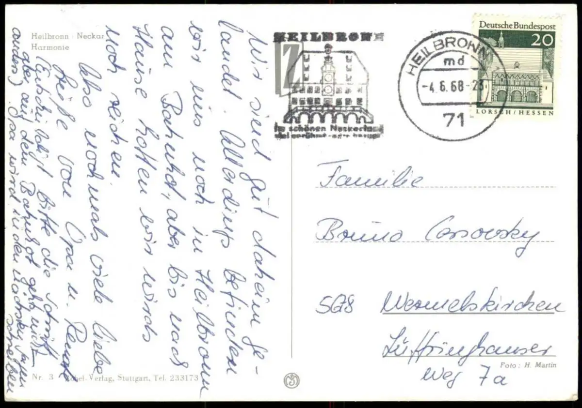 Gelaufen: 04.06.1968 mit Stempel Heilbronn die schöne Neckarstadt nach Wermelskirchen