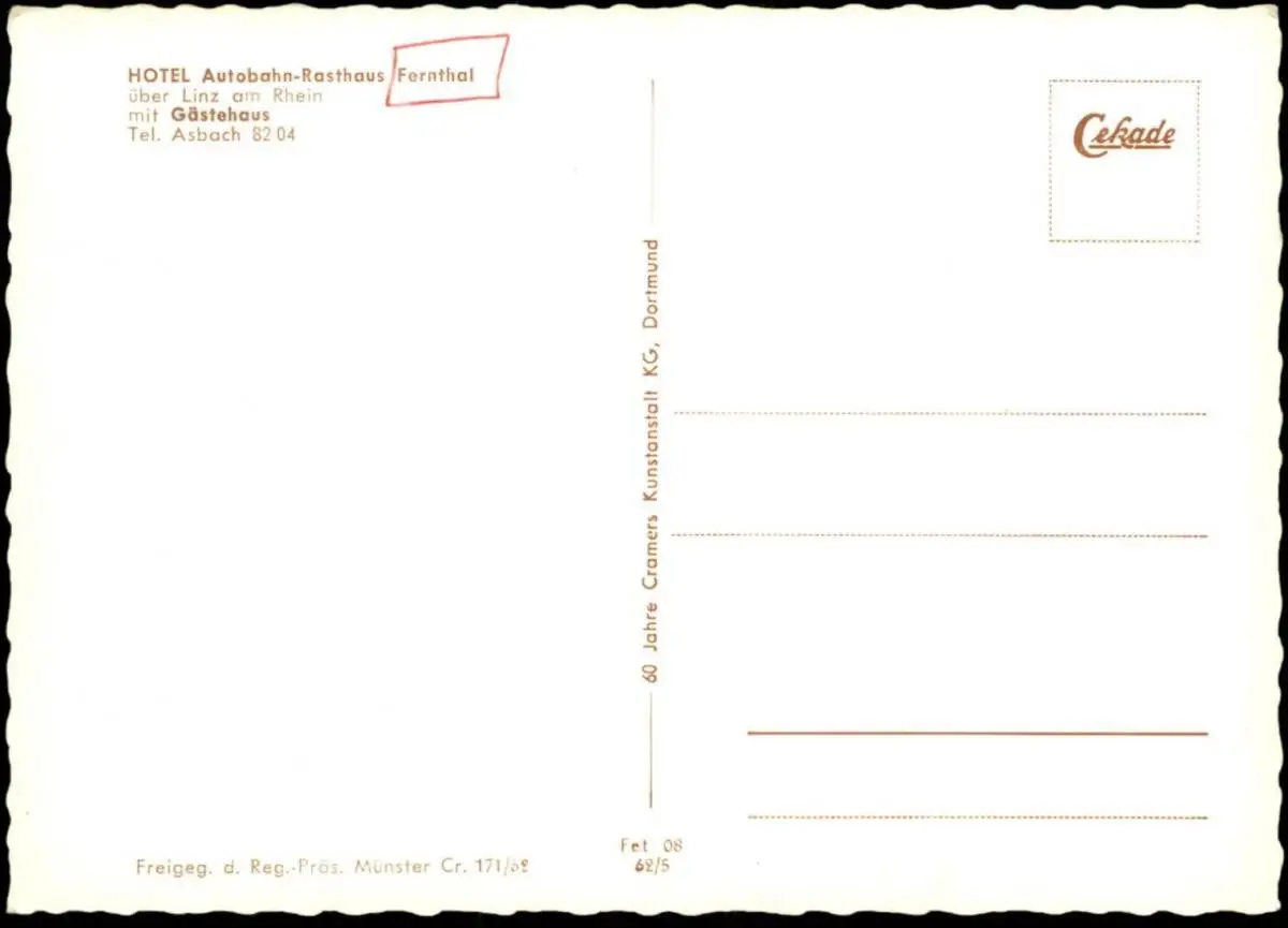 ÄLTERE POSTKARTE HOTEL AUTOBAHN-RASTHAUS FERNTHAL ÜBER LINZ ASBACH RASTHOF AUTOHOF RASTSTÄTTEVerlag: Cramers, DortmundGelaufen: neinErhaltung (s. Scan): gut - sehr gut / 918568