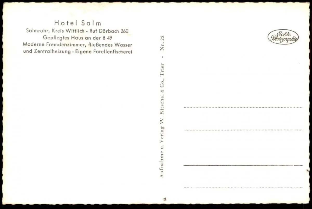 ÄLTERE POSTKARTE HOTEL SALM SALMROHR EIGENE FORELLENFISCHEREI MODERNE FREMDENZIMMER ZENTRALHEIZUNG FLIESSENDES WASSER
