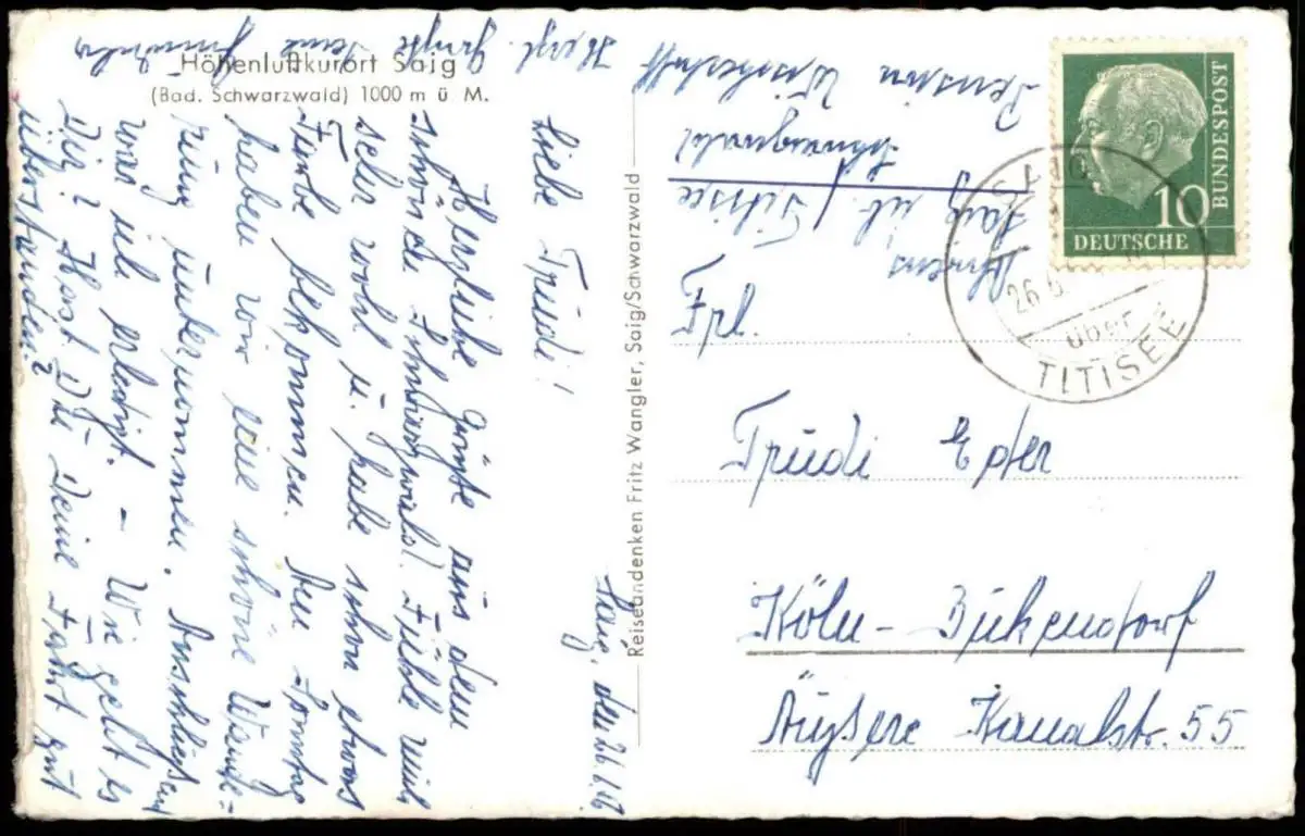 Gelaufen: 26.06.1956 mit Stempel Saig nach Köln-BickendorfErhaltung (s. Scan): mittel, rechter Rand etwas bestoßen / 917649