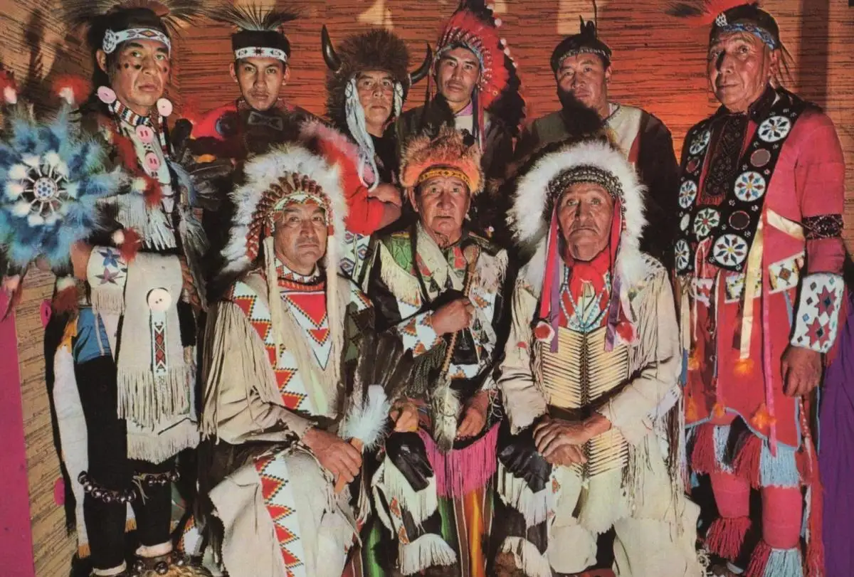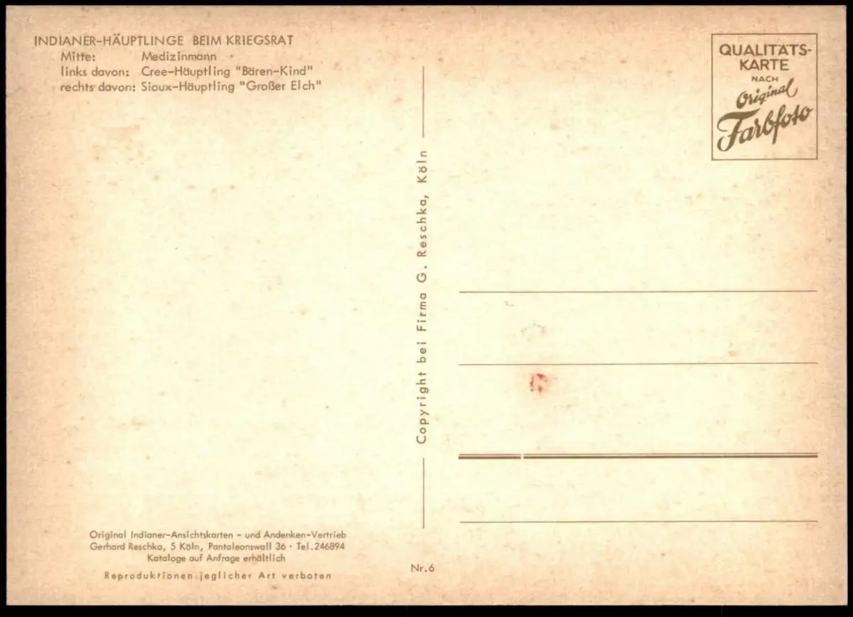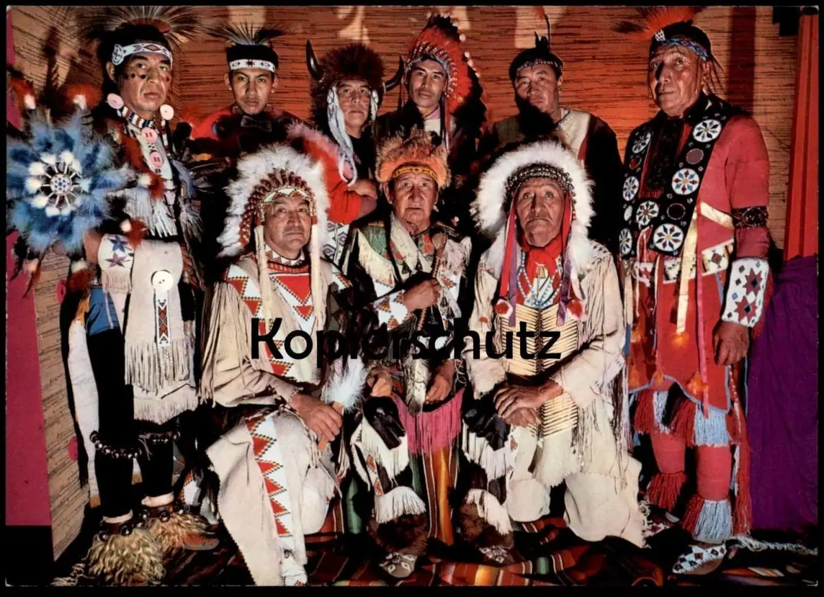 ÄLTERE POSTKARTE INDIANER HÄUPTLINGE BEIM KRIEGSRAT MITTE MEDIZINMANN LINKS DAVON CREE-HÄUPTLING BÄREN-KIND RECHTS DAVON SIOUX-HÄUPTLING GROSSER ELCH