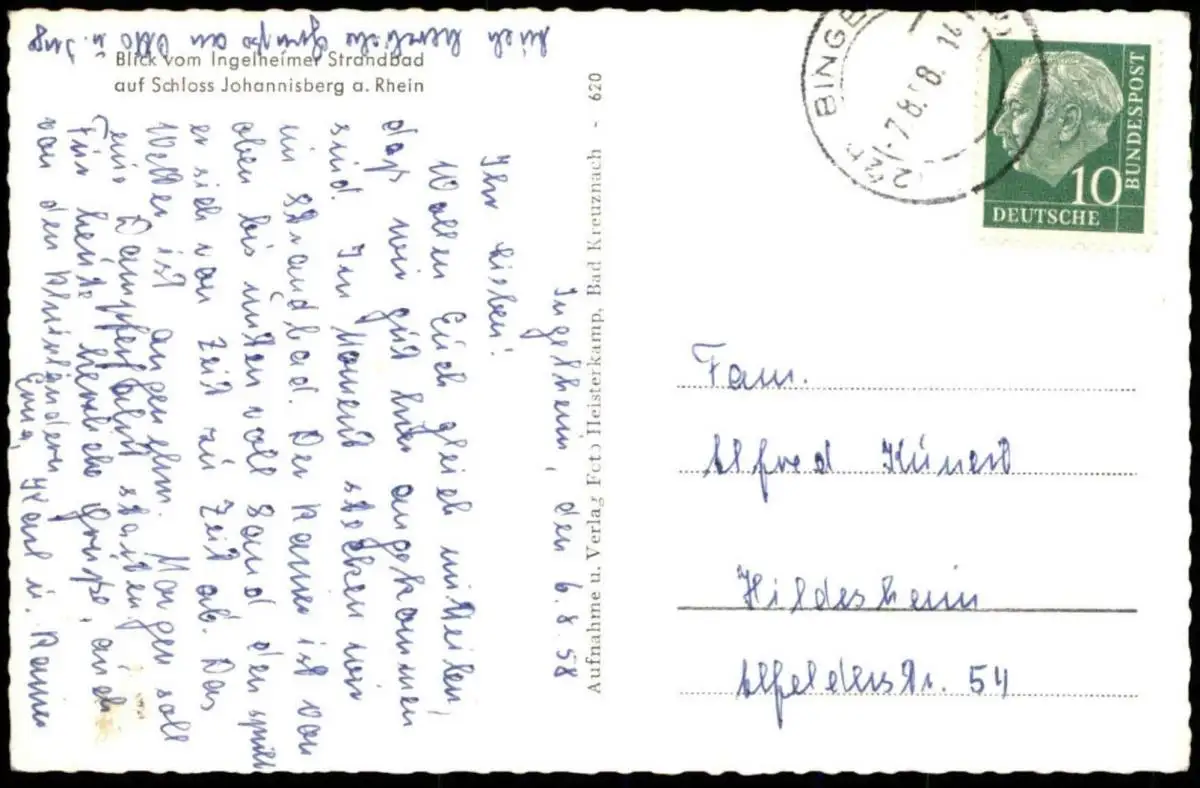 Gelaufen: 07.08.1958 mit Stempel Bingen nach Hildesheim