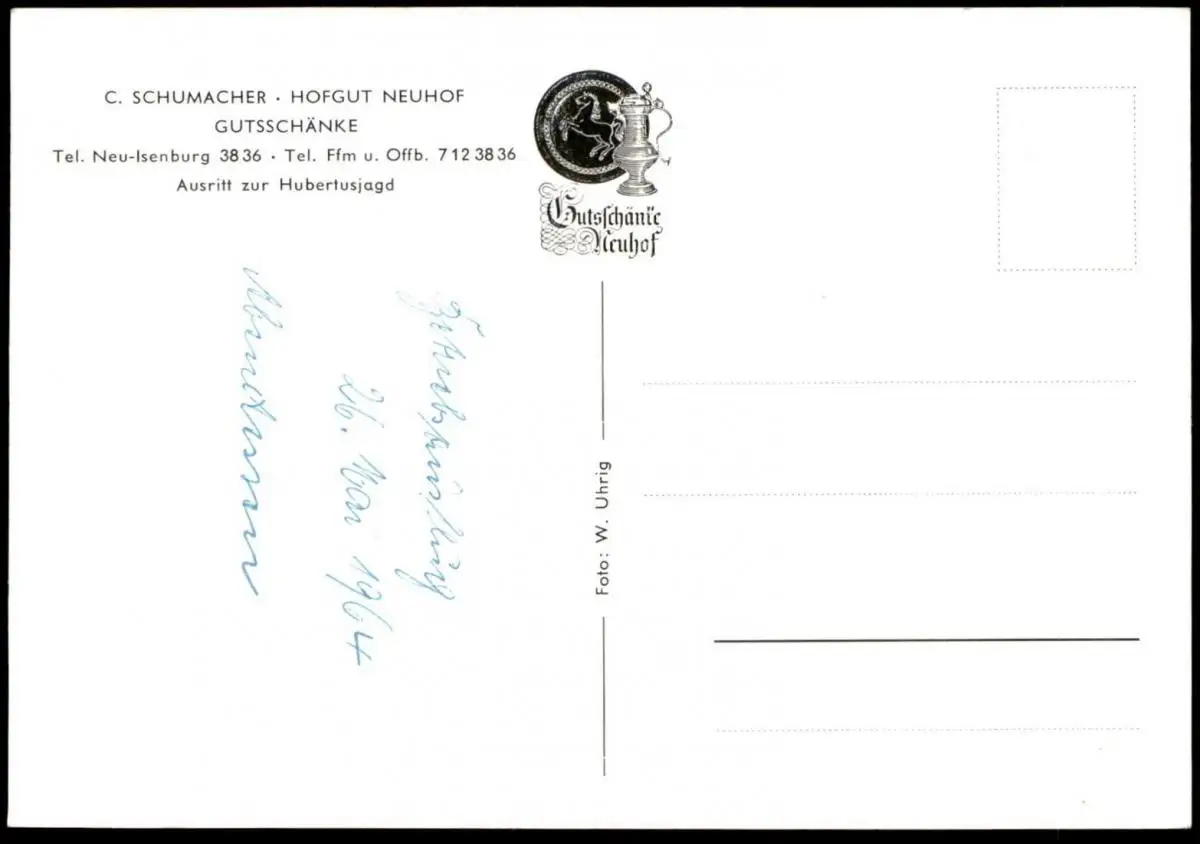 ÄLTERE POSTKARTE JAGD HUBERTUSJAGD JÄGER HUNDE PFERDE HOFGUT NEUHOF C. SCHUMACHER TELEFON NEU-ISENBURG 3836 TELEFON FRANKFURT MAIN UND OFFENBACH 7123836