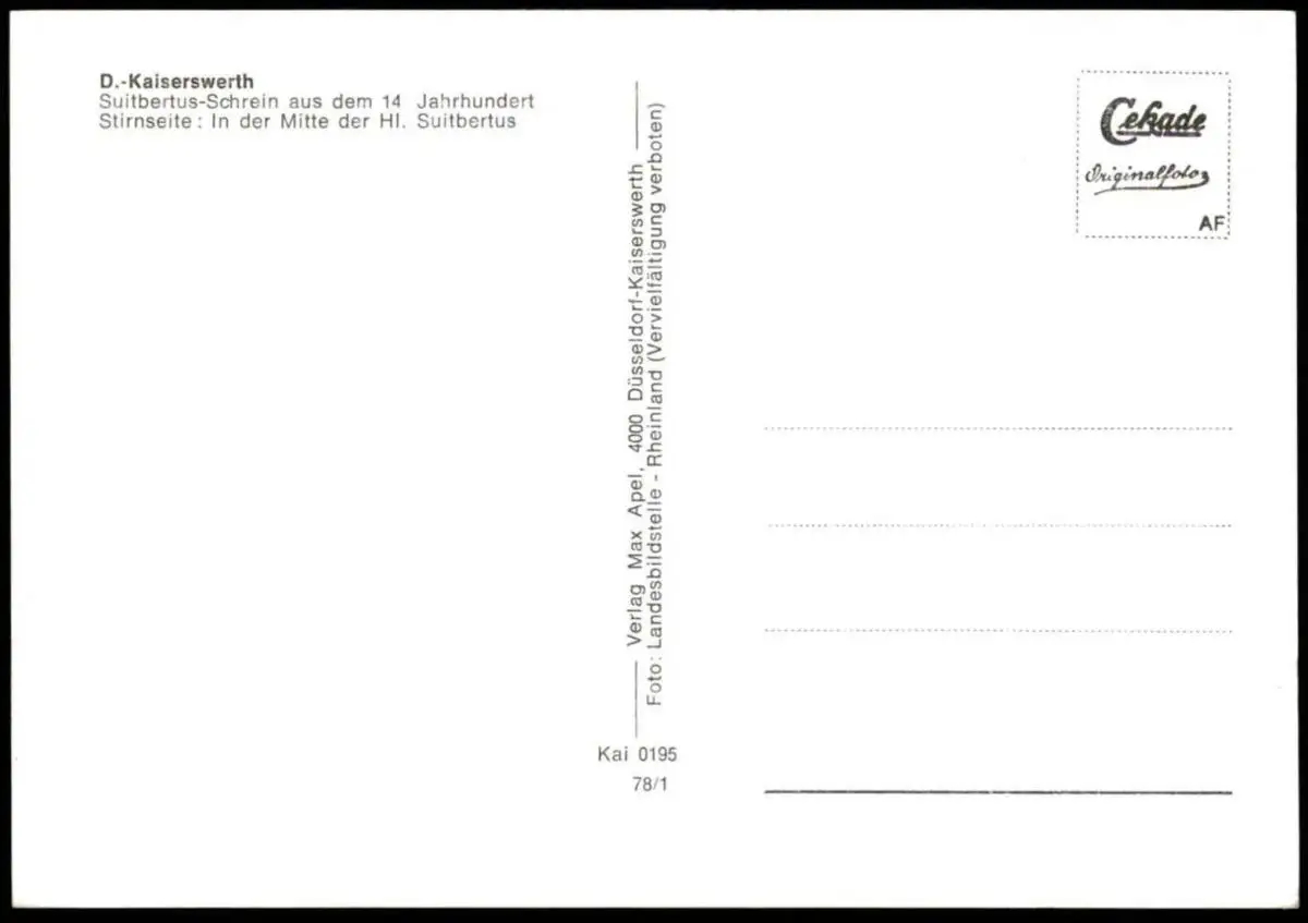 ÄLTERE POSTKARTE KAISERSWERTH SUITBERTUS SCHREIN AUS DEM 14. JAHRHUNDERT Stirnseite: In der Mitte der Hl. Suitbertus
