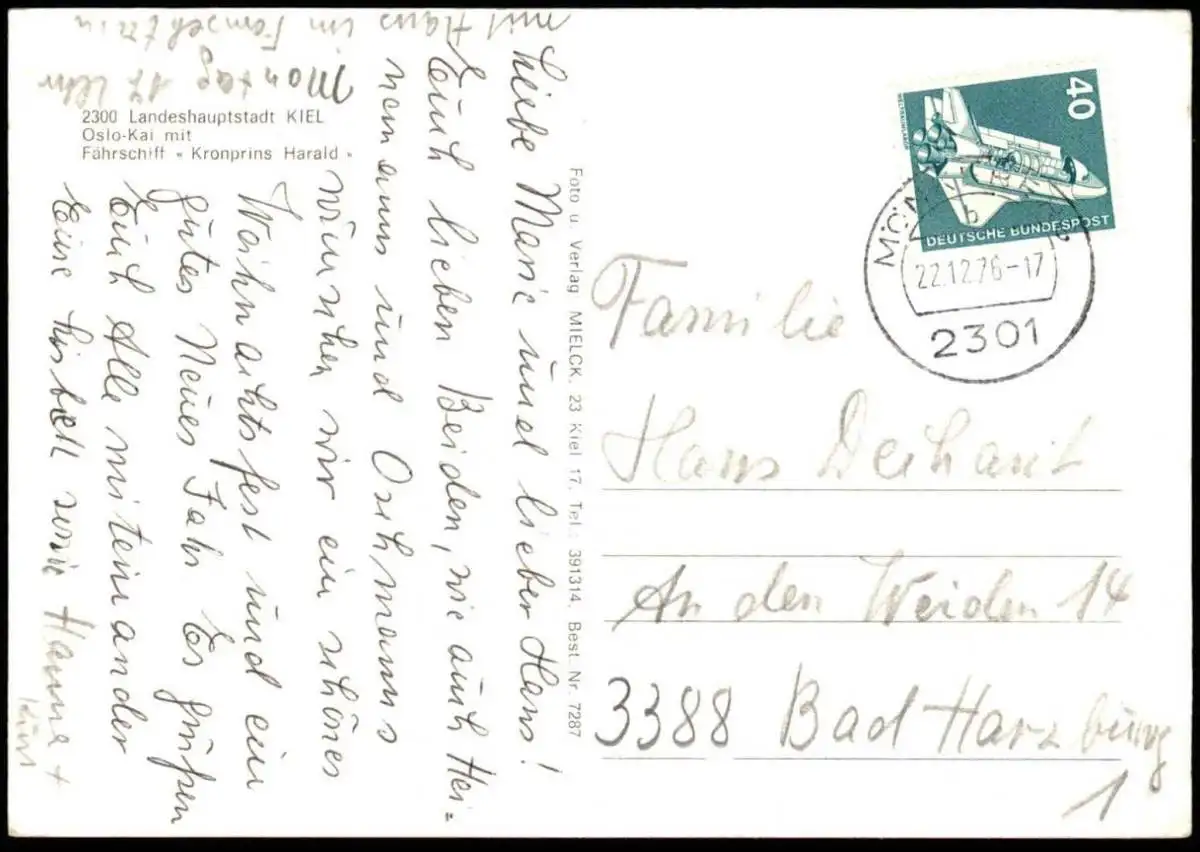 ÄLTERE POSTKARTE KIEL FÄHRSCHIFF KRONPRINS HARALD AM OSLO-KAIVerlag: Mielck, KielGelaufen: 22.12.1976 mit Stempel Mönkeberg nach BarzburgErhaltung (s. Scan): gut - mittel, Stempelspuren vorderseitig, Ecken minimal bestoßen / 918670