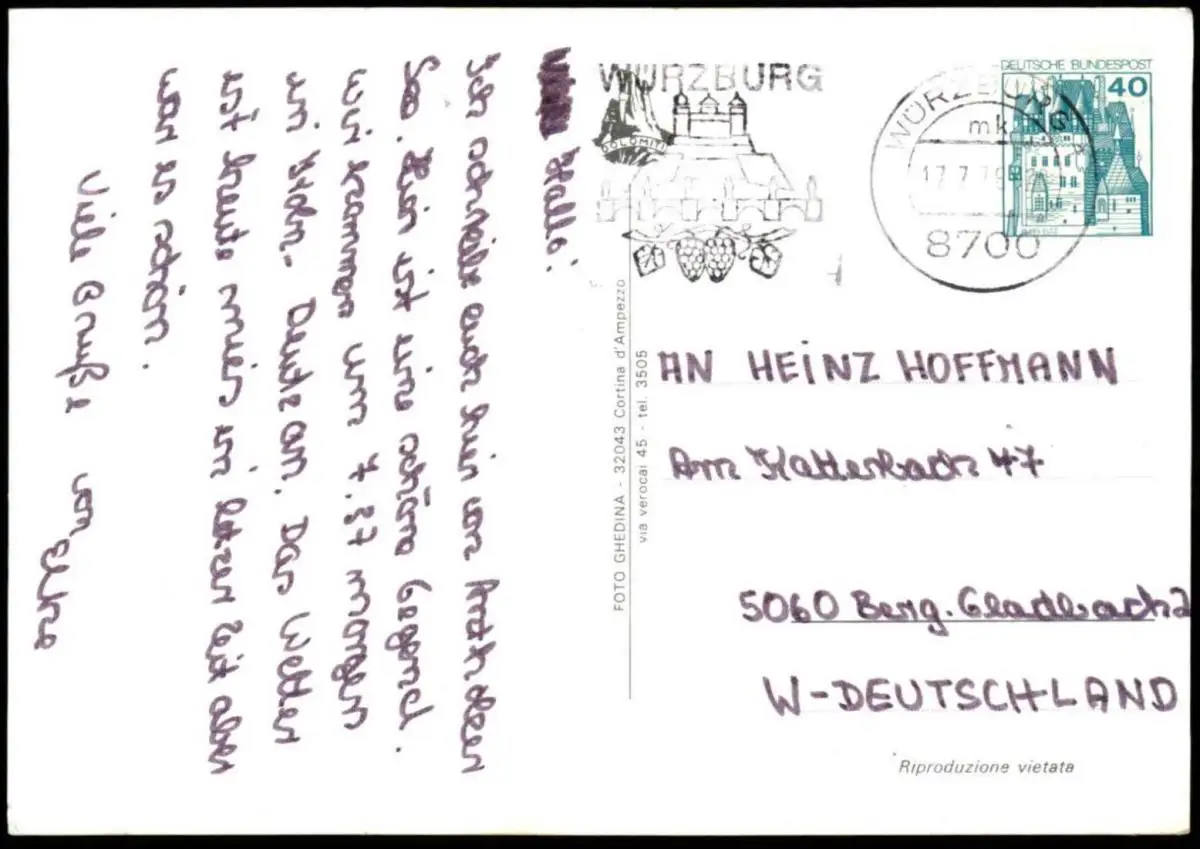 Gelaufen: 17.07.1978 mit Stempel Würzburg nach Bergisch Gladbach